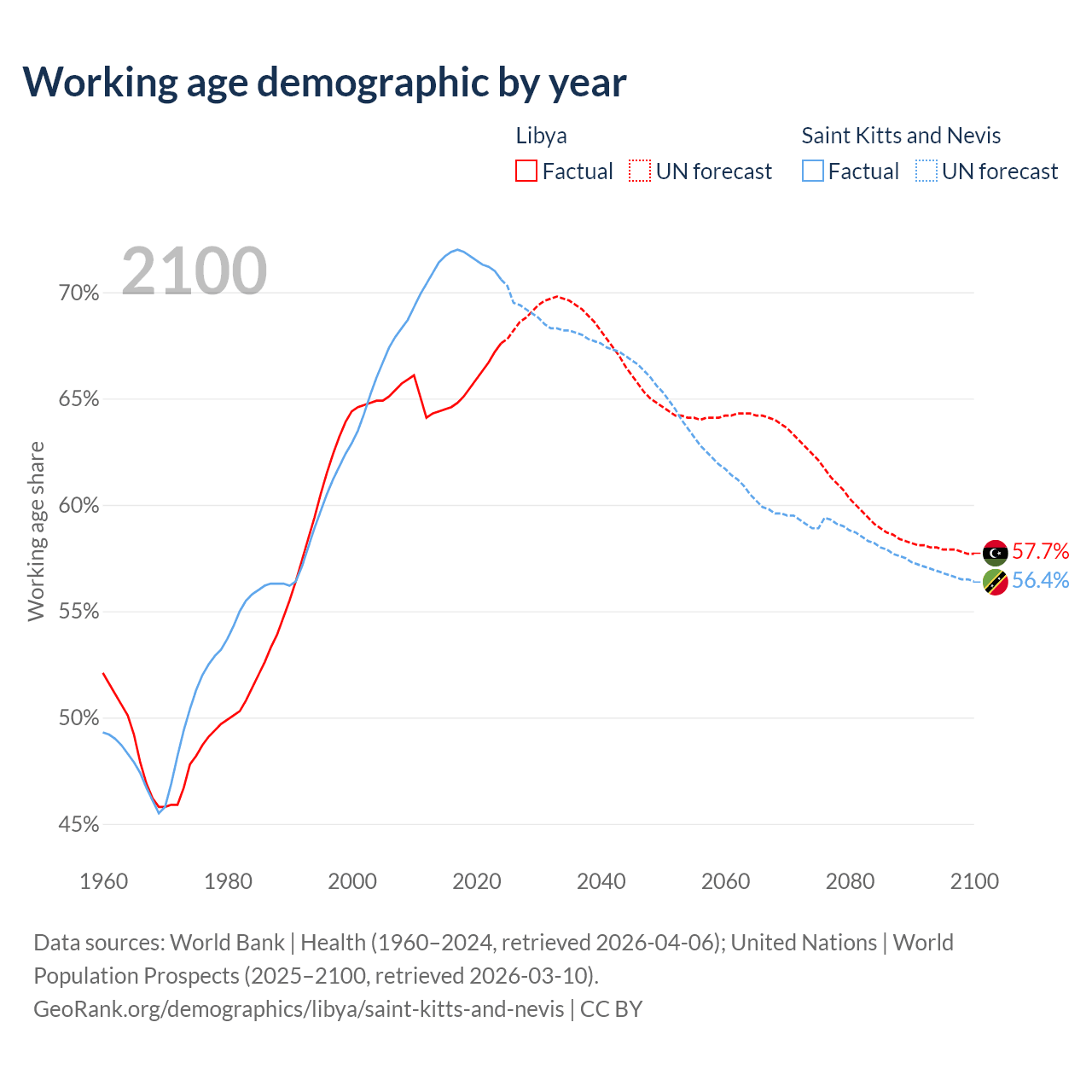 - The share of young demographic (0-15 years old) in Libya is 27.4% vs 18.2% in Saint Kitts and Nevis.