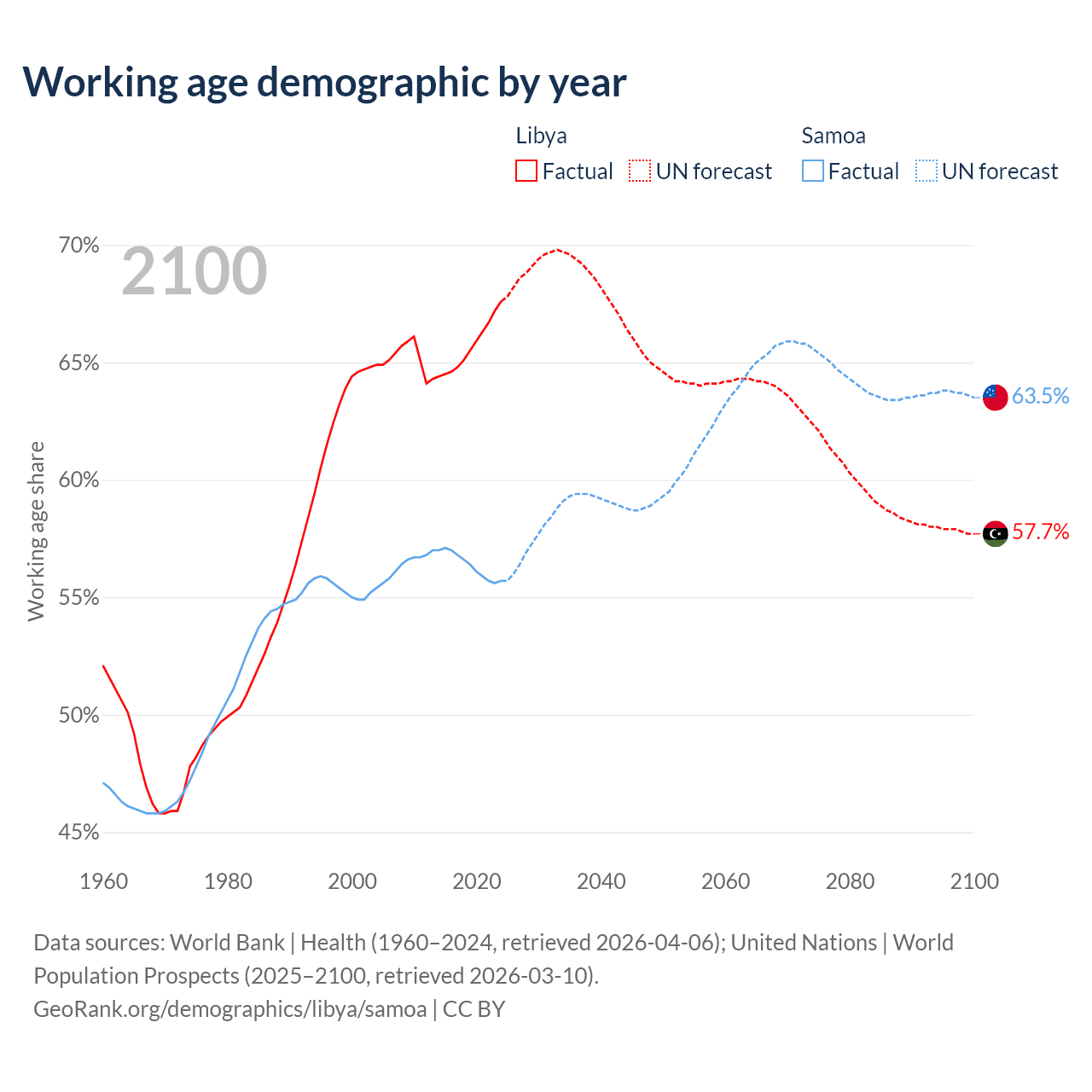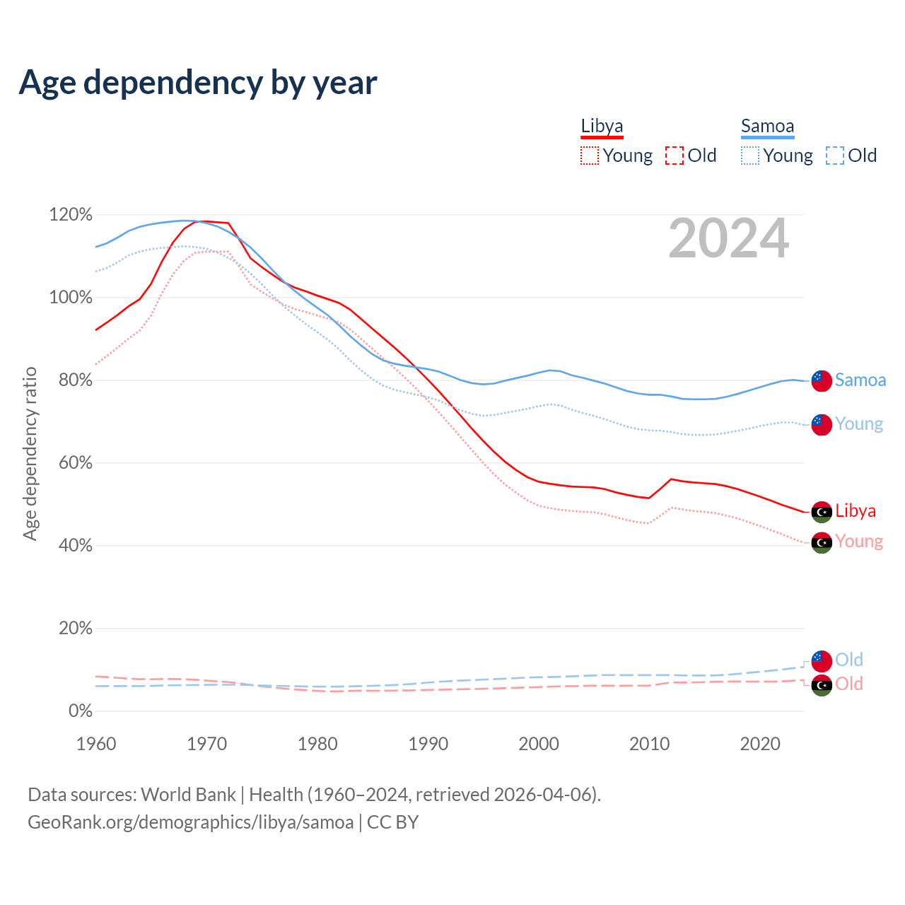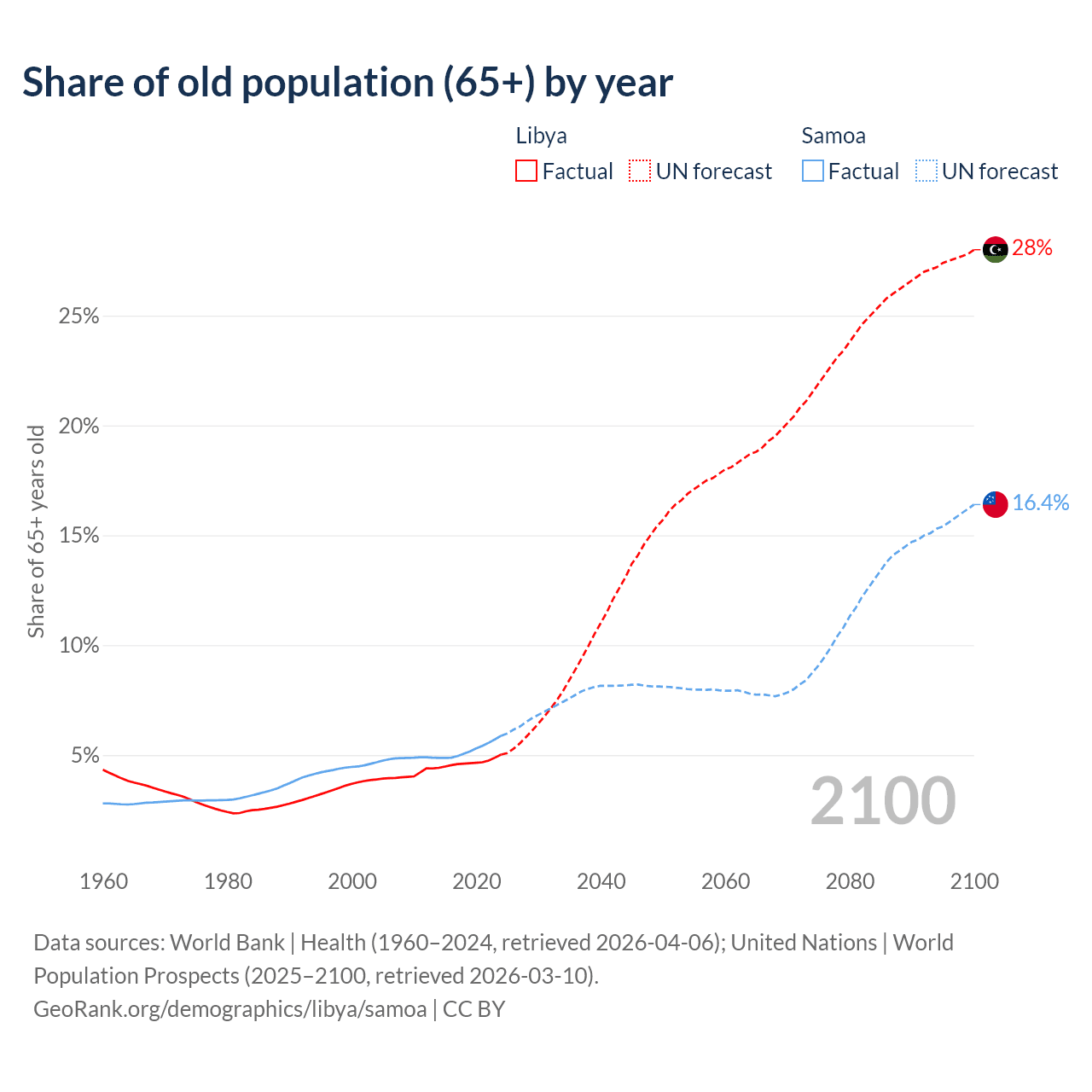 - The share of old-age demographic (65+) in Libya is 5.02% vs 5.88% in Samoa.