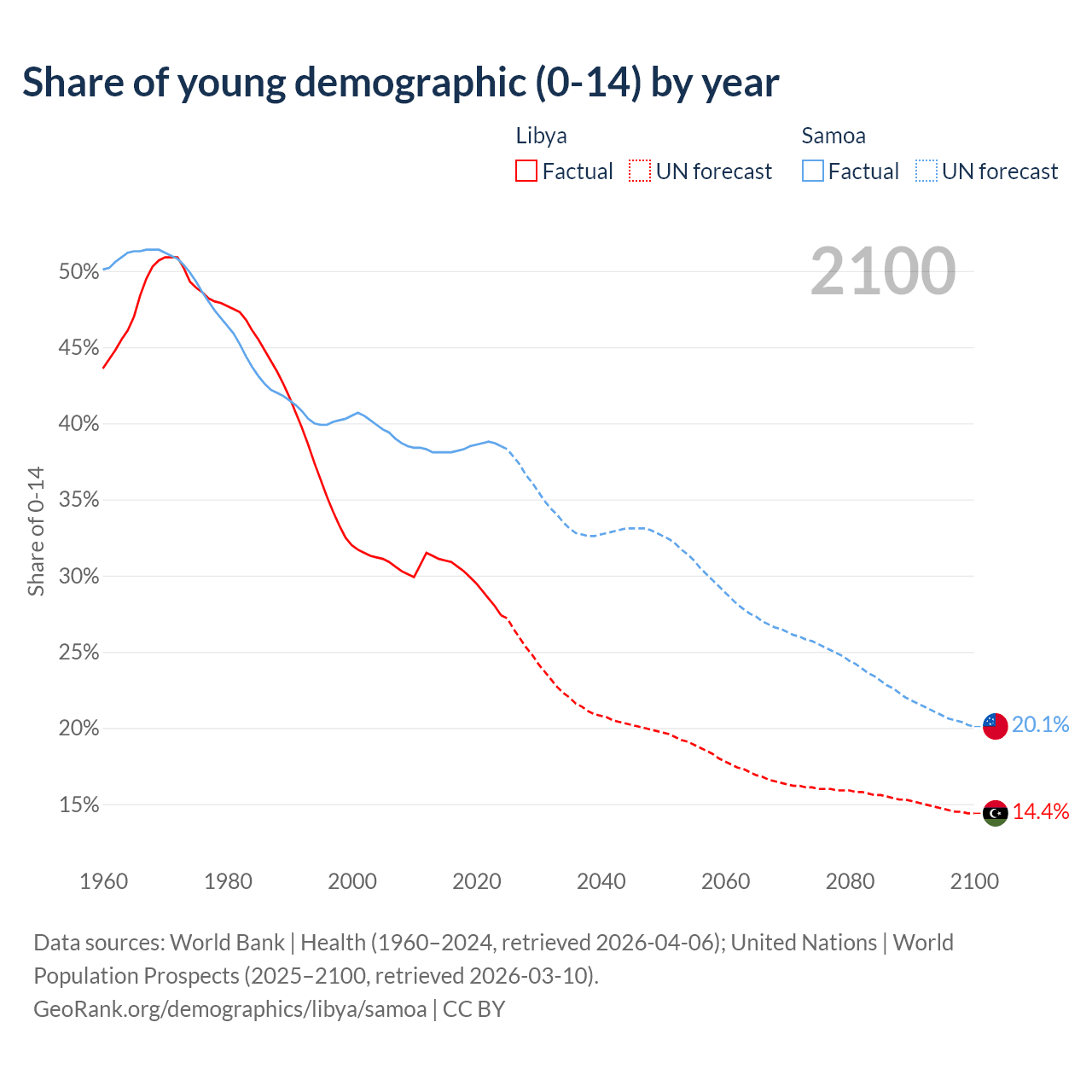 - The share of young demographic (0-15 years old) in Libya is 27.4% vs 38.5% in Samoa.