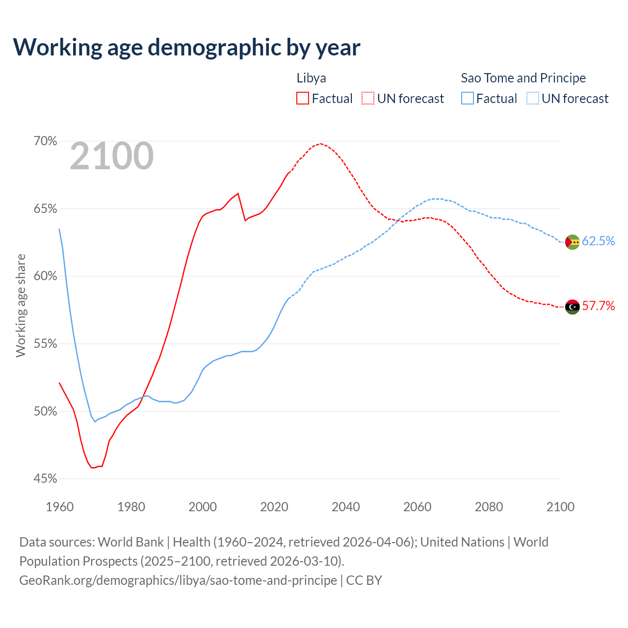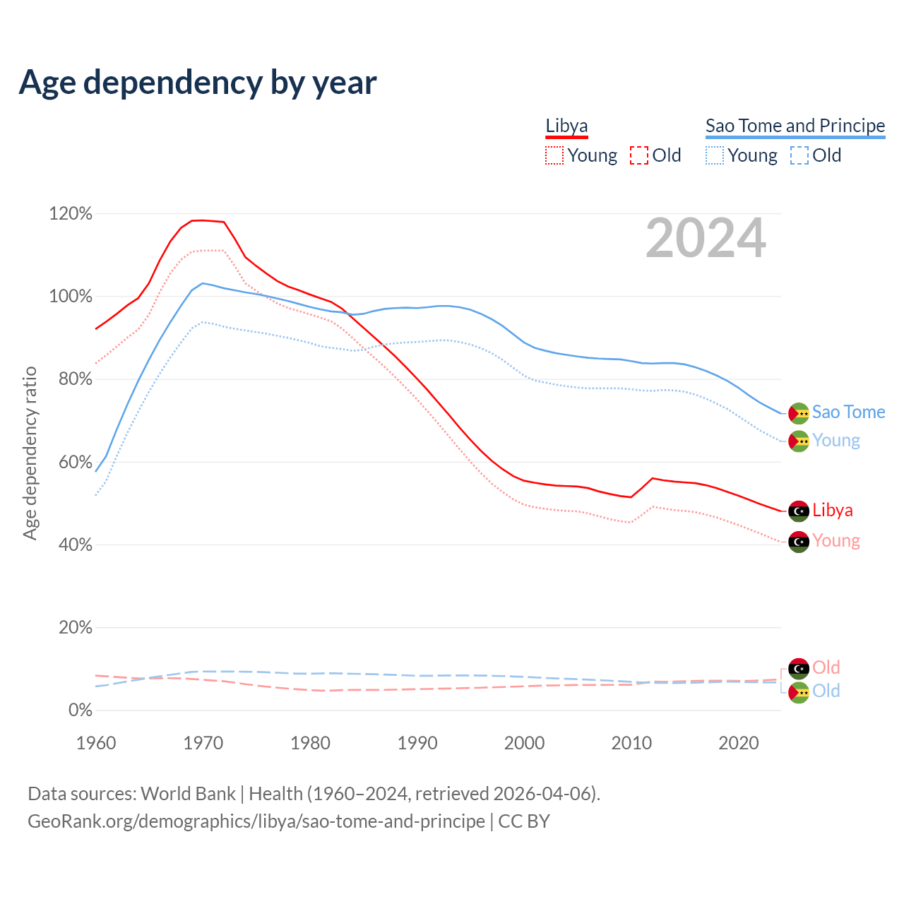 - Libya is ranked 114/196 by median age (oldest to youngest) vs 163/196 for Sao Tome and Principe.