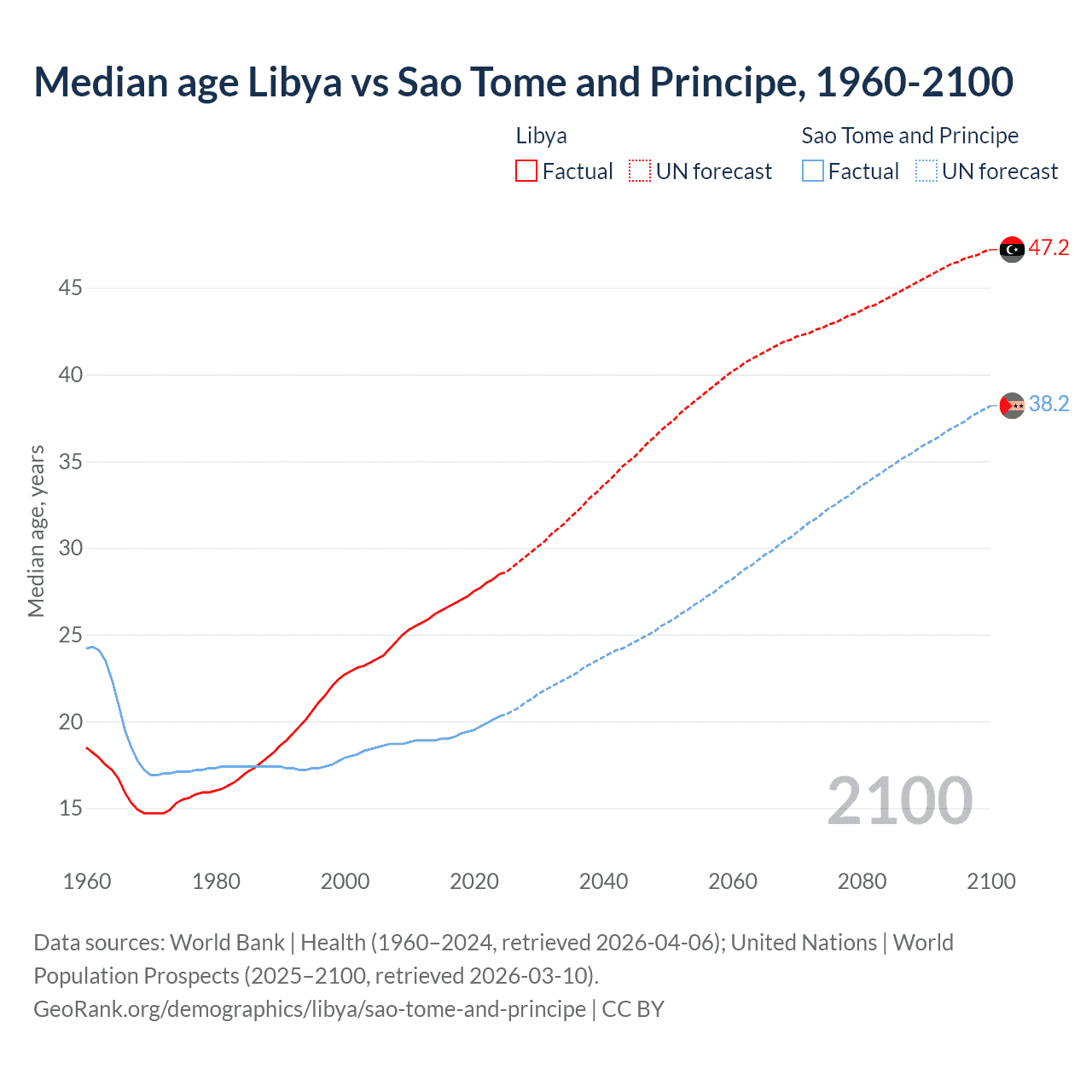Median age Libya vs Sao Tome and Principe, 1960-2100