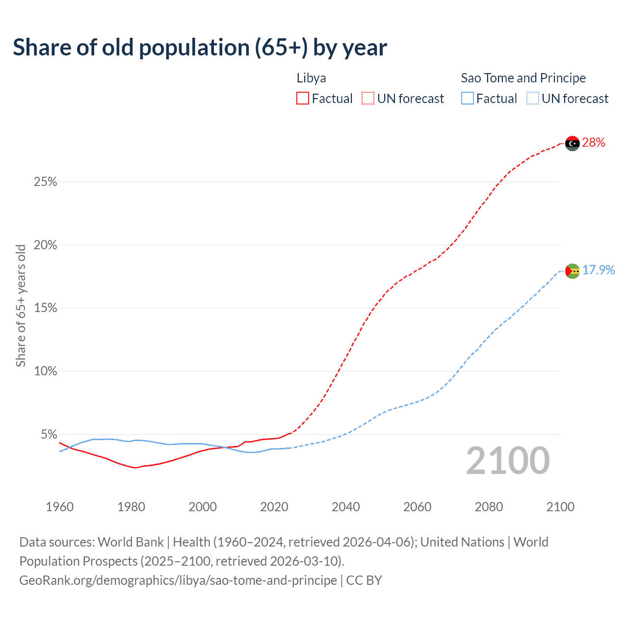 The share of older people aged 65 and over is 5.02% in Libya and 3.9% in Sao Tome and Principe. Life expectancy in Libya compared to Sao Tome and Principe .