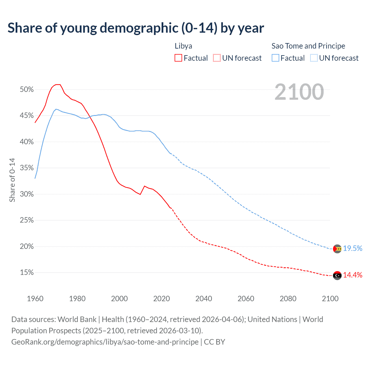 - The share of young demographic (0-15 years old) in Libya is 27.4% vs 37.8% in Sao Tome and Principe.