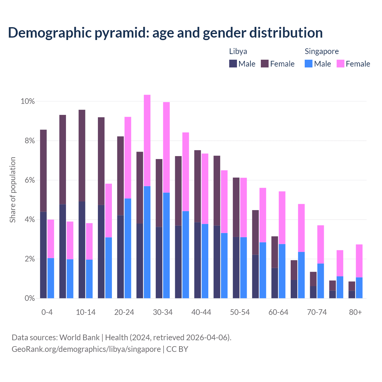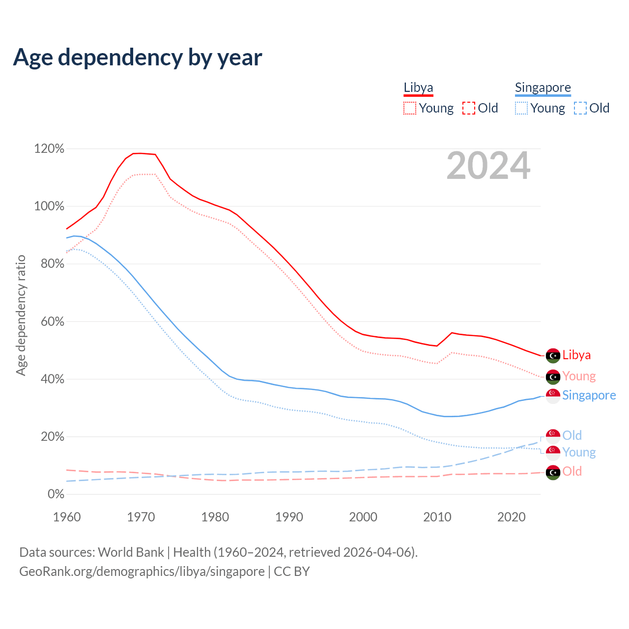- Libya is ranked 114/196 by median age (oldest to youngest) vs 68/196 for Singapore.