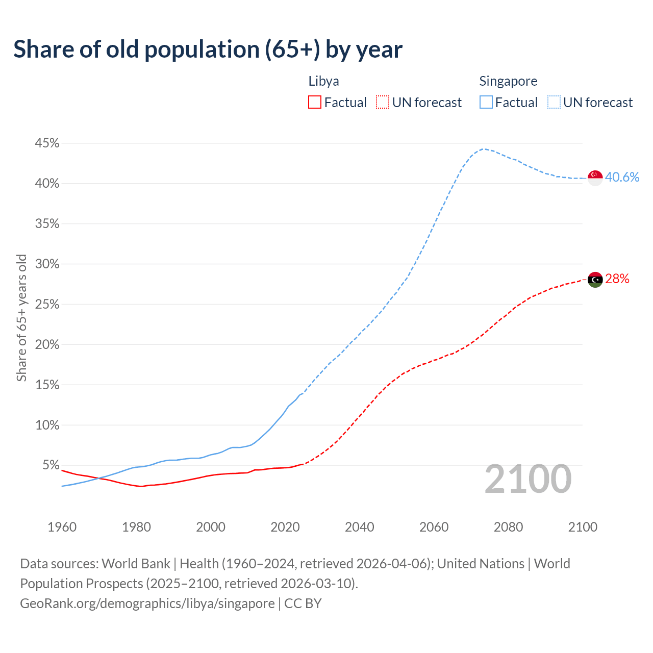 The share of older people aged 65 and over is 5.02% in Libya and 13.7% in Singapore. Life expectancy in Libya compared to Singapore .