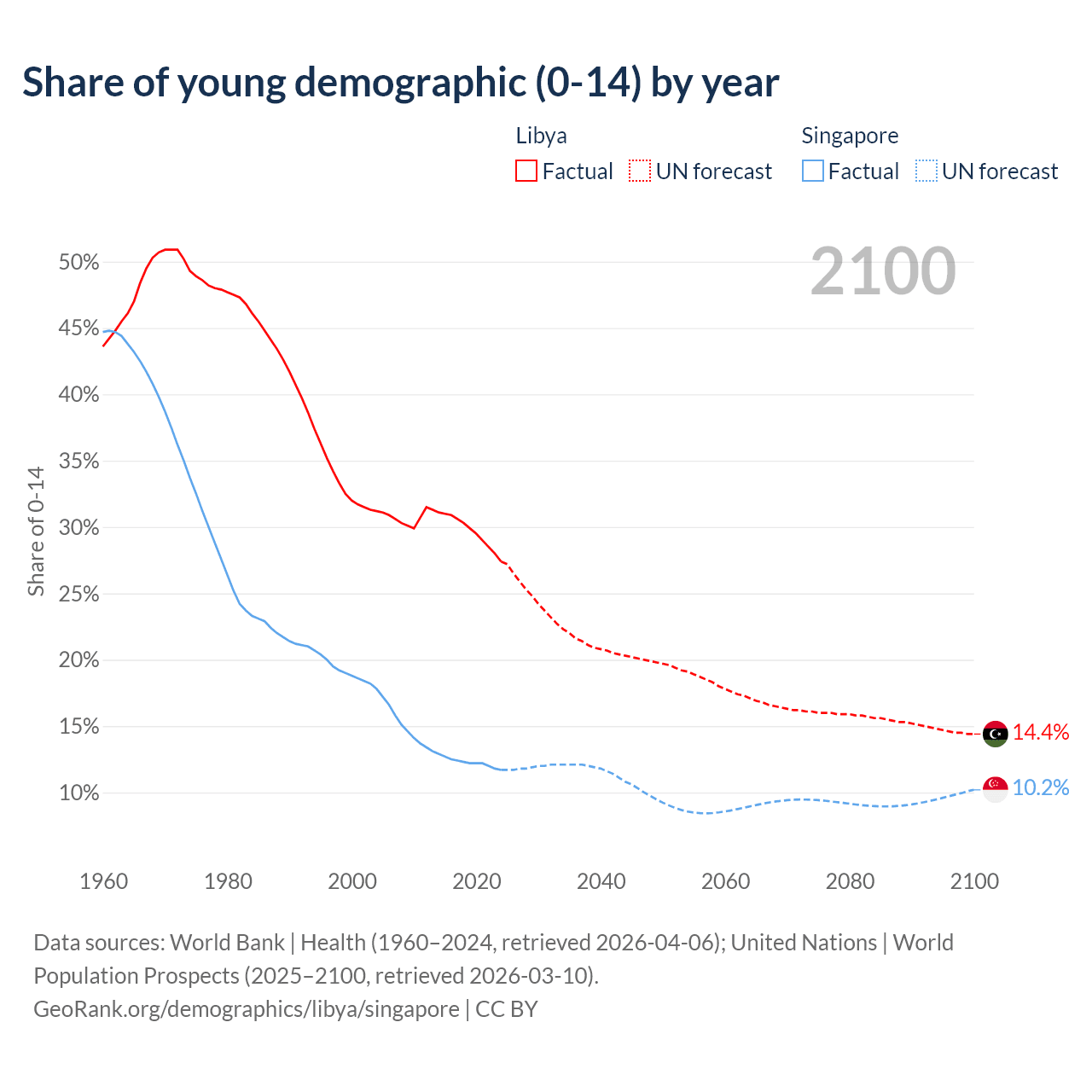 - The share of young demographic (0-15 years old) in Libya is 27.4% vs 11.7% in Singapore.