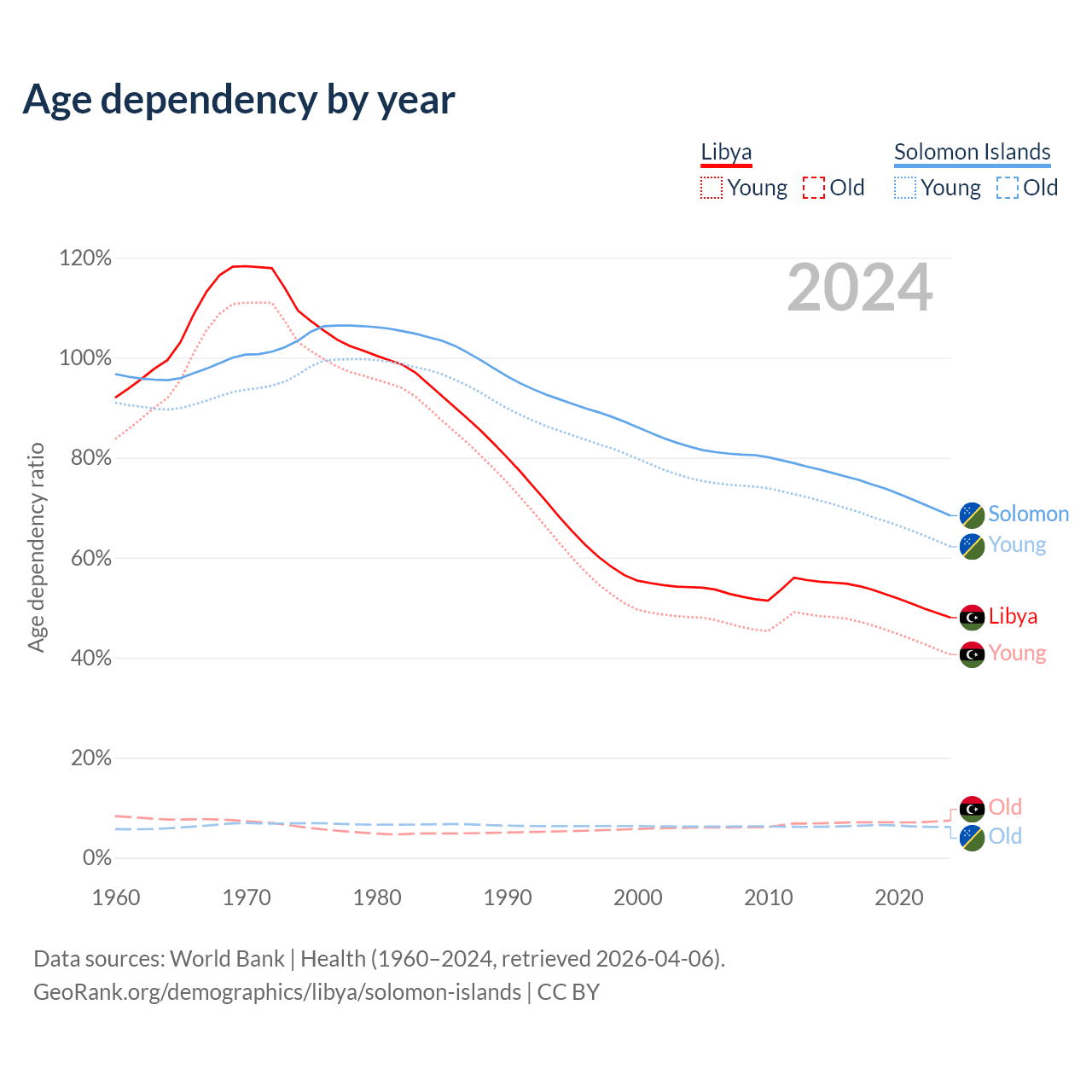 - The share of old-age demographic (65+) in Libya is 5.02% vs 3.64% in the Solomon Islands.