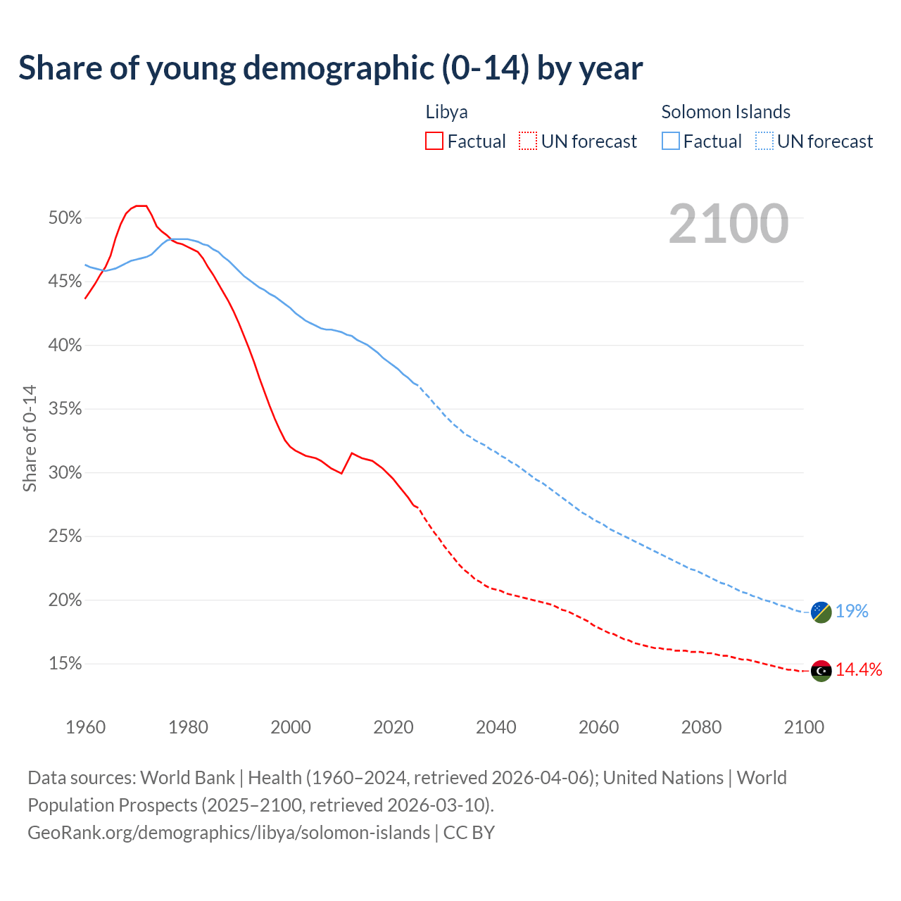 - The share of young demographic (0-15 years old) in Libya is 27.4% vs 37% in the Solomon Islands.