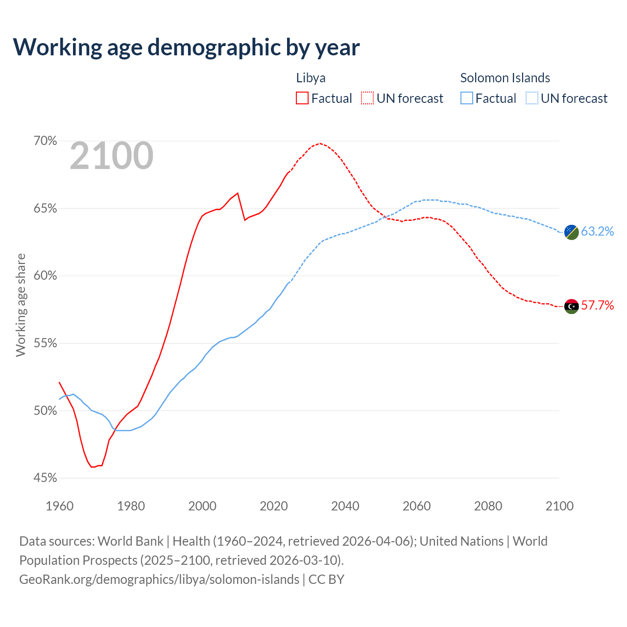 Median age Libya vs Solomon Islands, 1960-2100