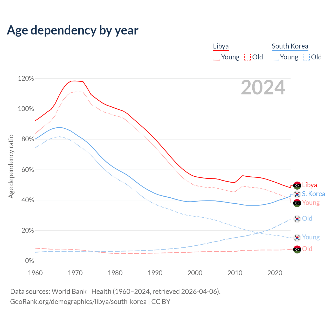 - Libya is ranked 114/196 by median age (oldest to youngest) vs 10/196 for South Korea.