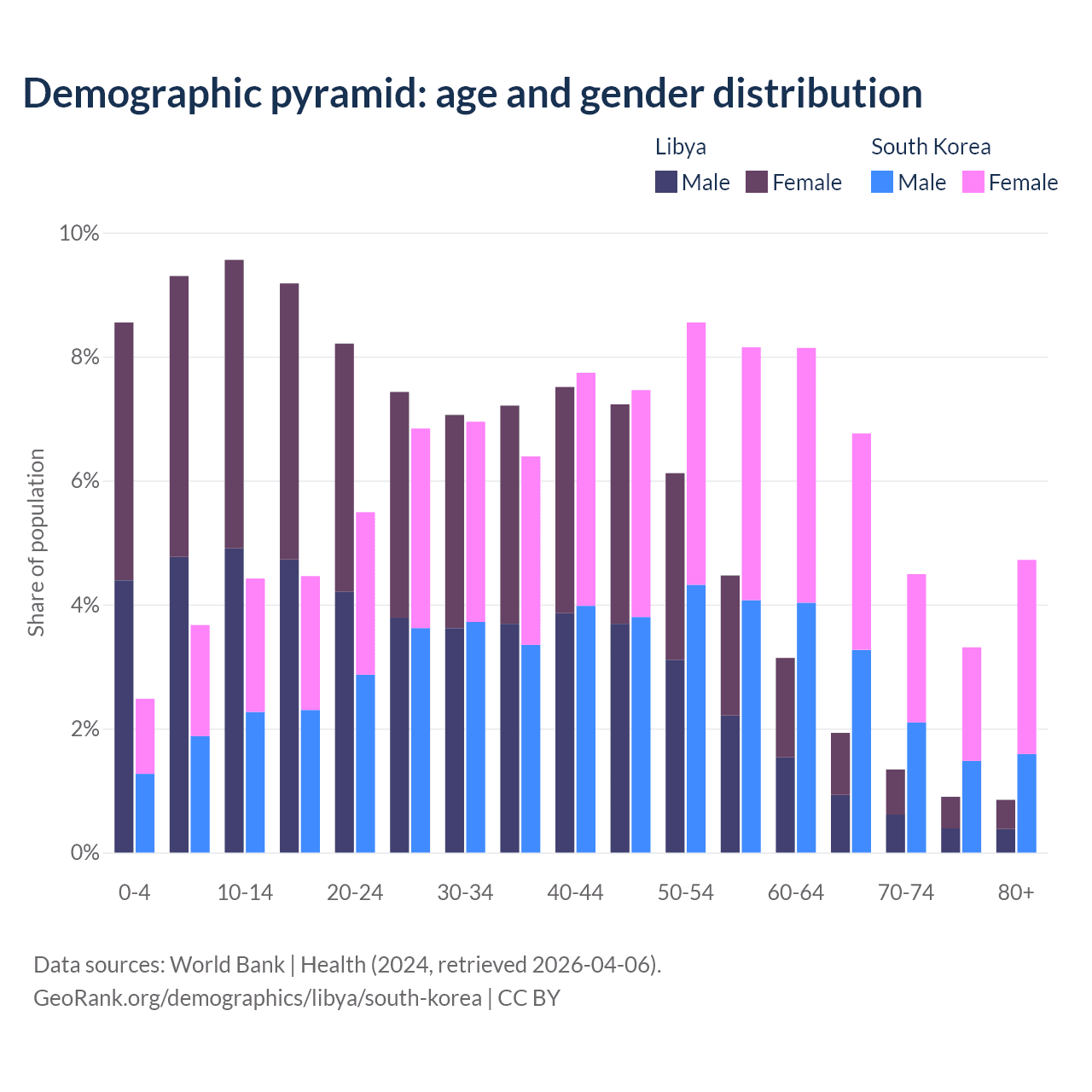 - As of 2026, the population of Libya is 7.56M vs 51.6M in South Korea - 6.83 times difference.