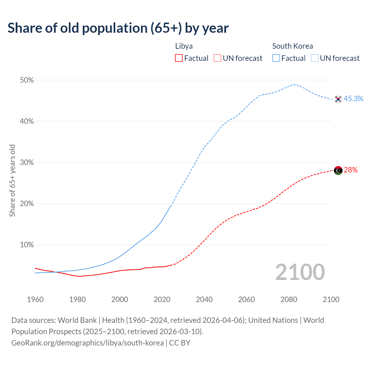 The share of older people aged 65 and over is 5.02% in Libya and 19.3% in South Korea. Life expectancy in Libya compared to South Korea .