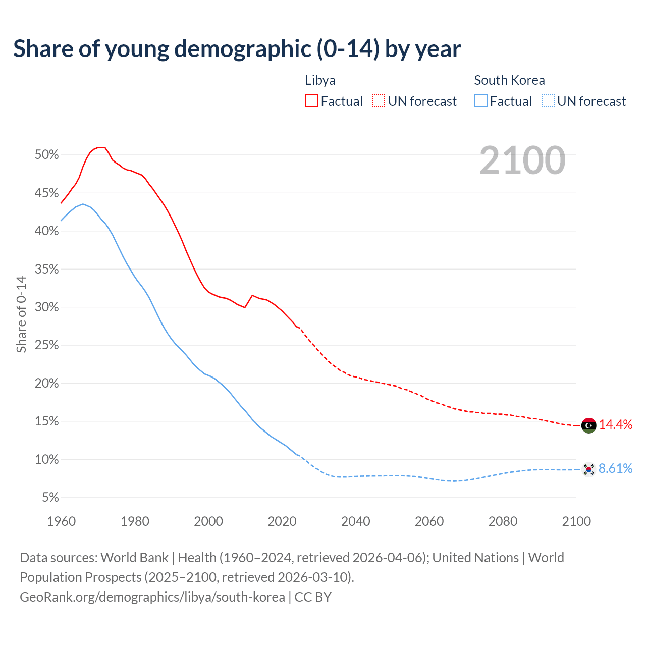 - The share of young demographic (0-15 years old) in Libya is 27.4% vs 10.6% in South Korea.