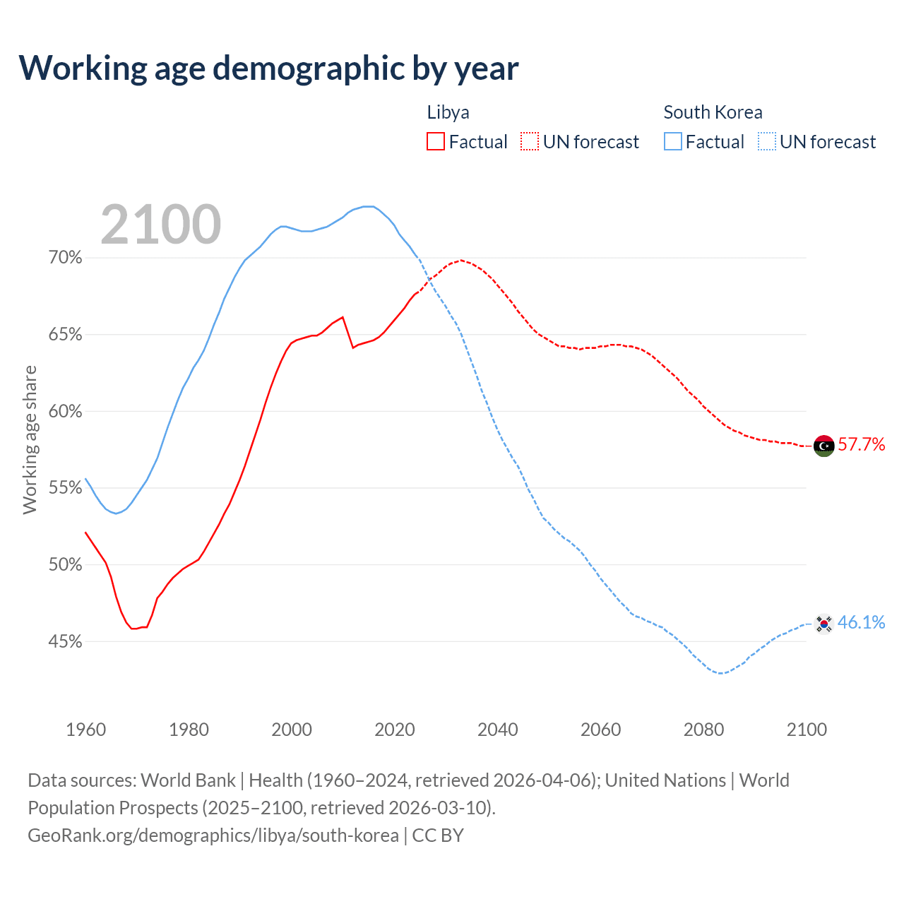 - Libya has 5.11M working age adults (aged 15-64) vs 36.2M in South Korea.