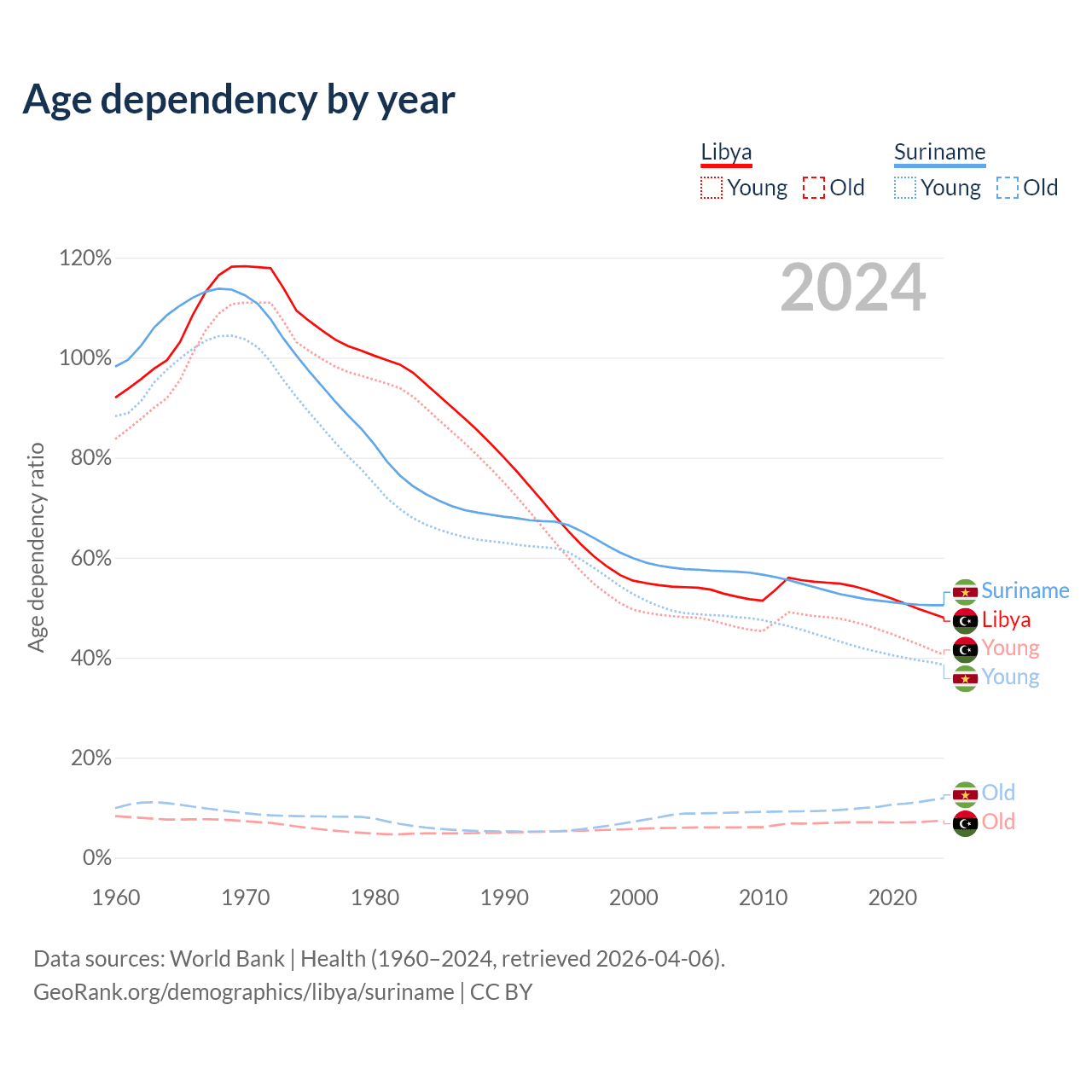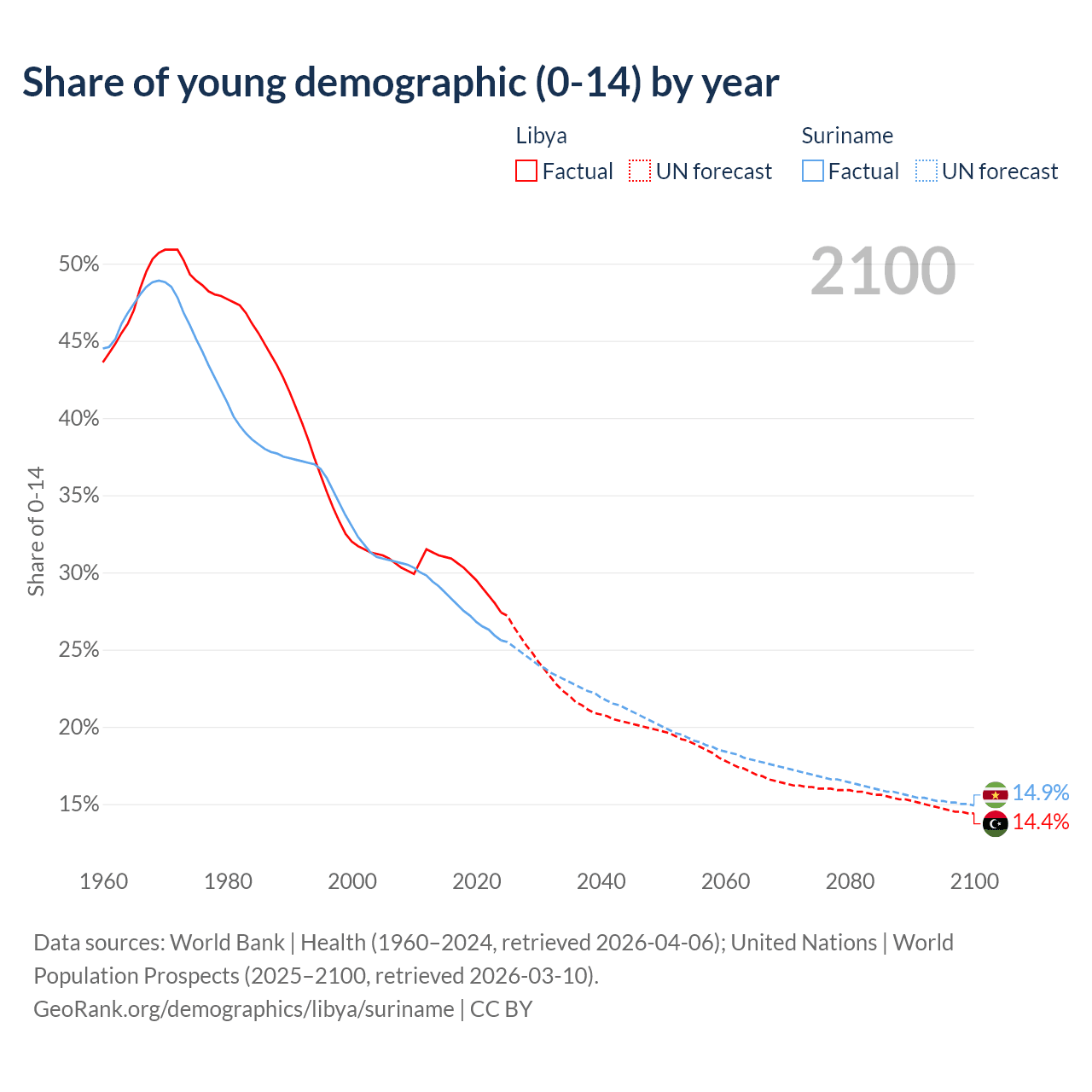 - The share of young demographic (0-15 years old) in Libya is 27.4% vs 25.6% in Suriname.