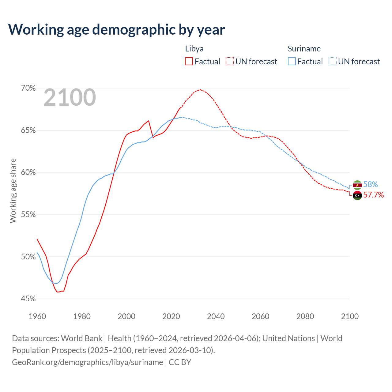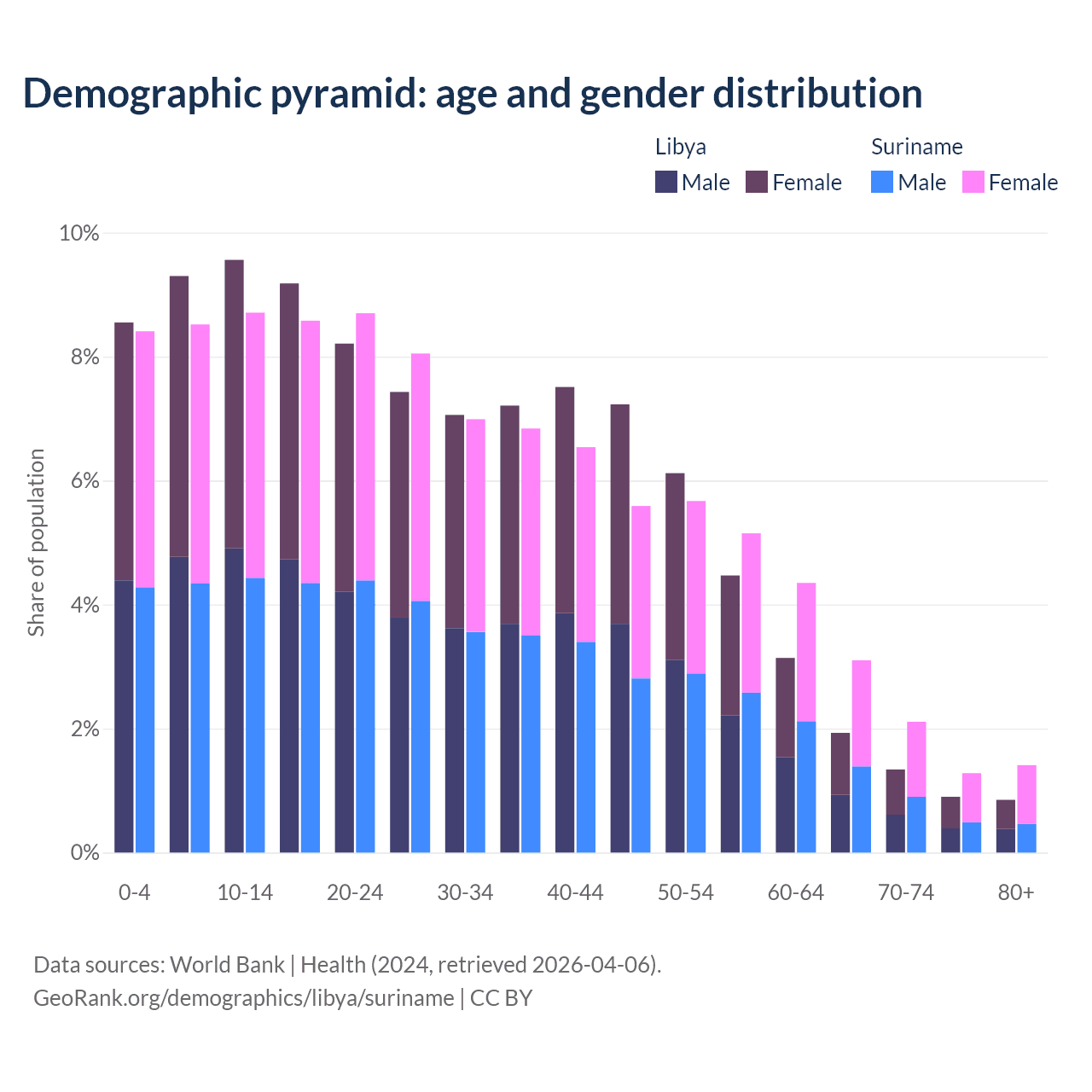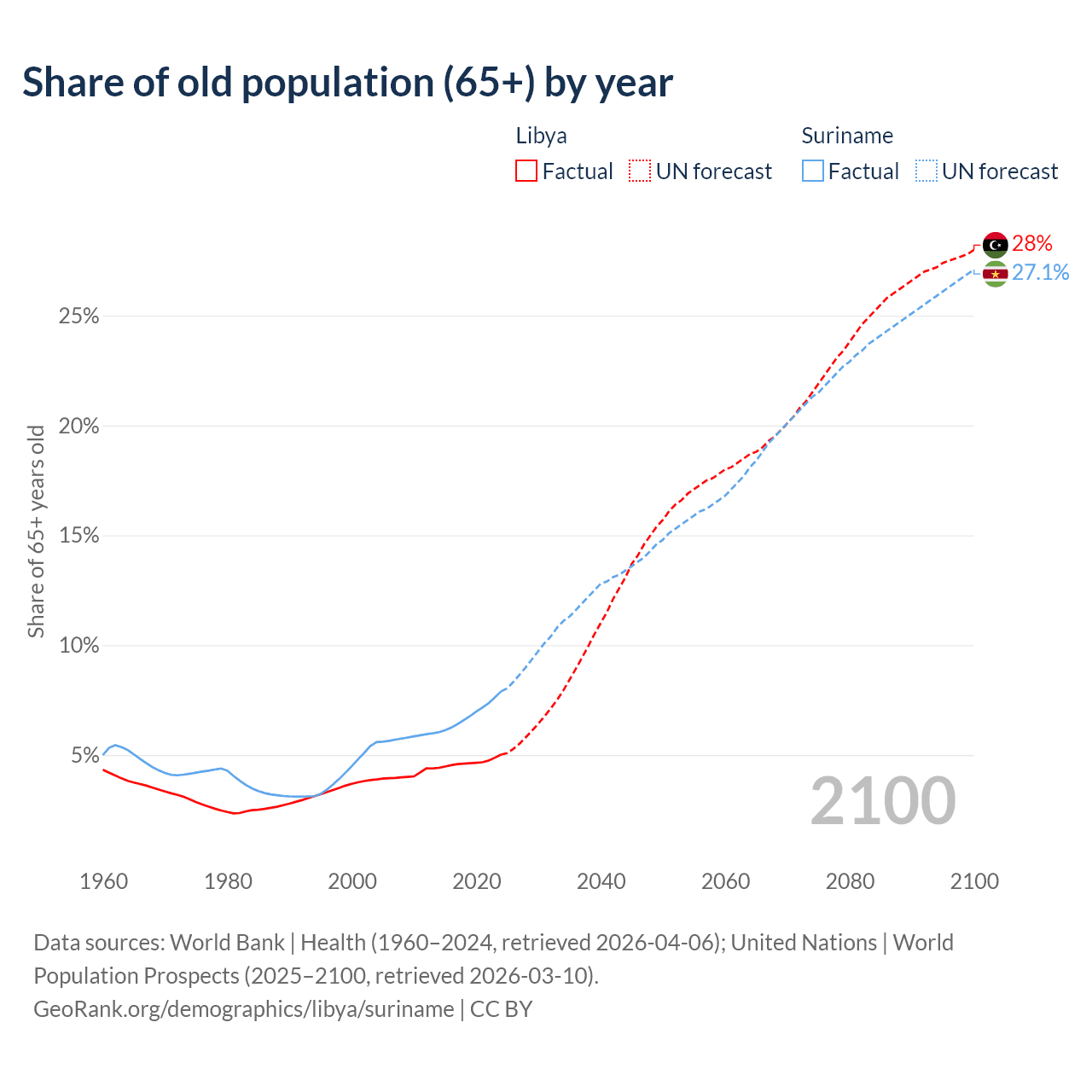 - The share of old-age demographic (65+) in Libya is 5.02% vs 7.9% in Suriname.