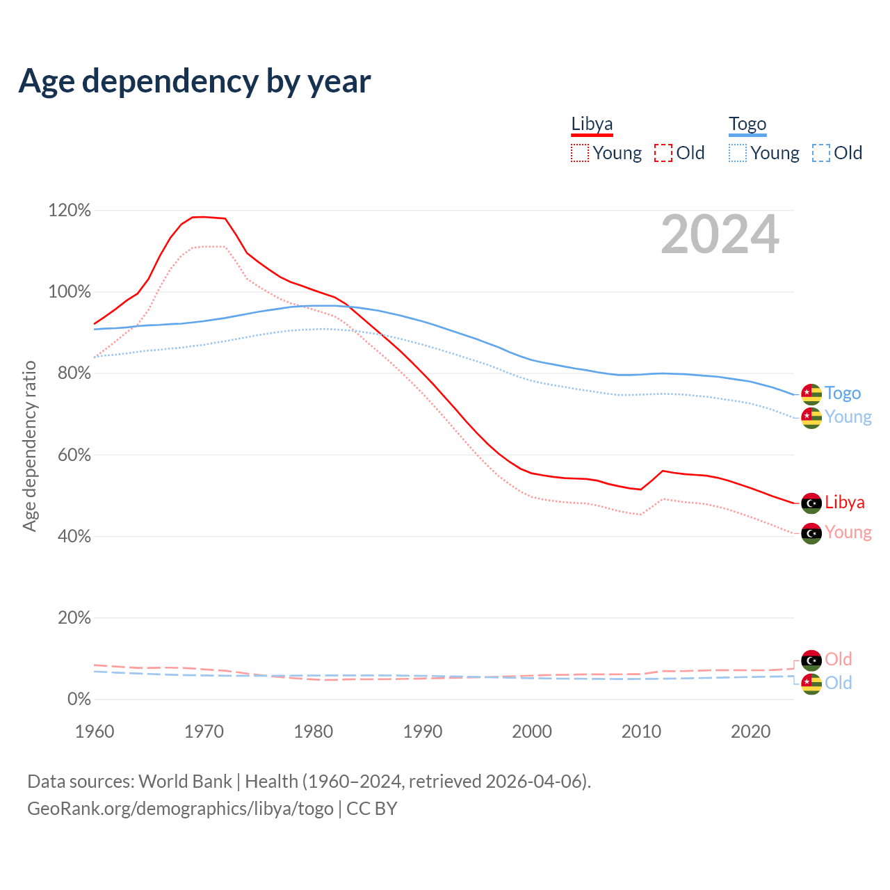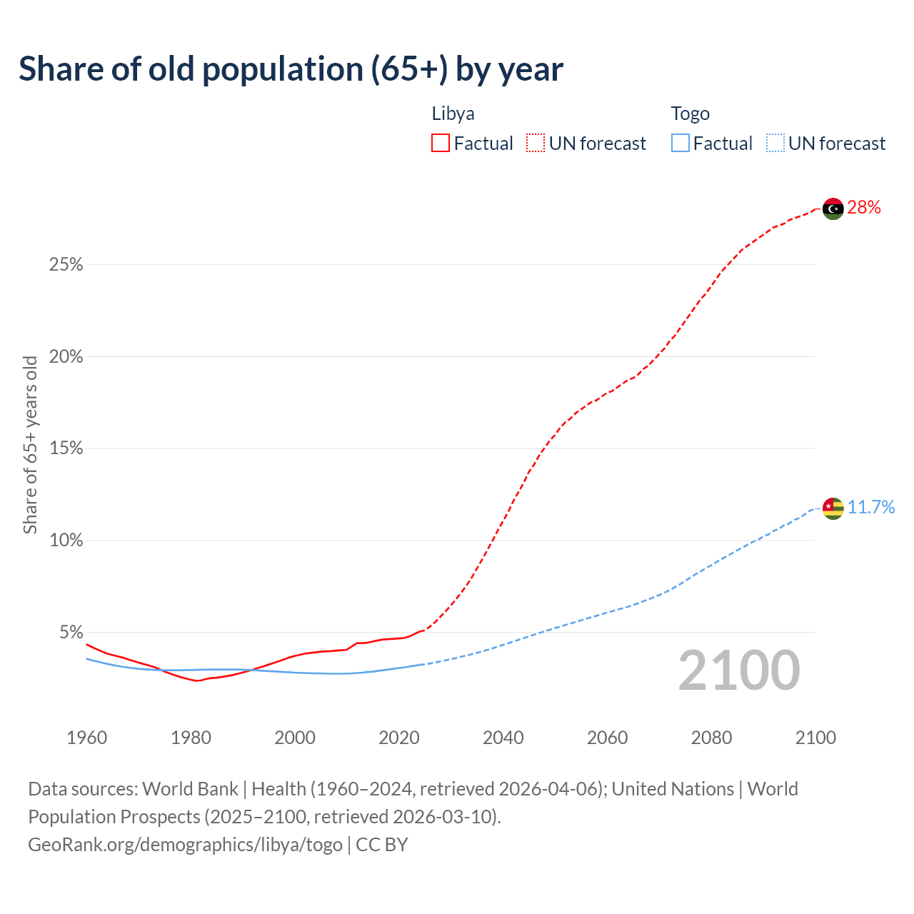 - The share of old-age demographic (65+) in Libya is 5.02% vs 3.21% in Togo.