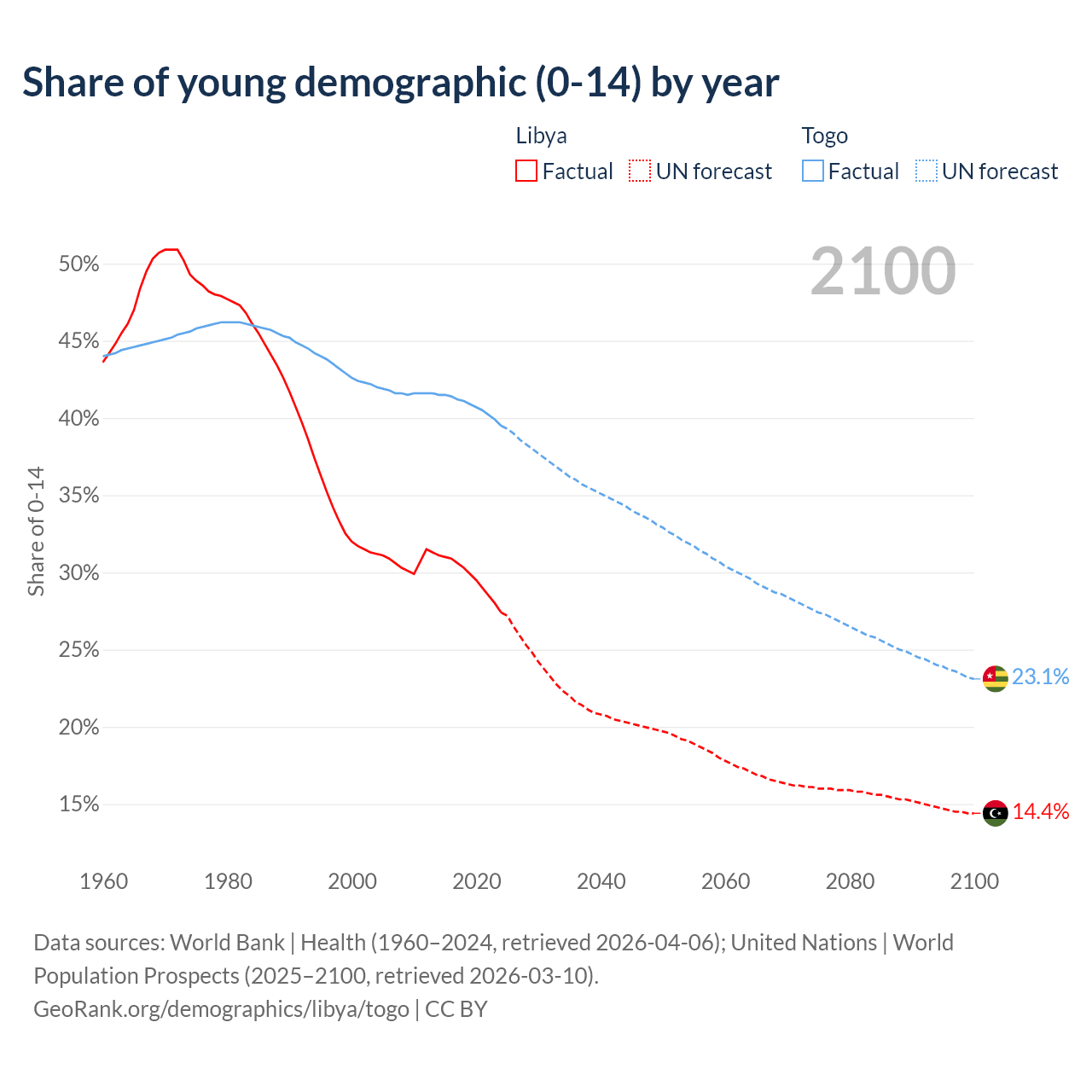 - The share of young demographic (0-15 years old) in Libya is 27.4% vs 39.5% in Togo.
