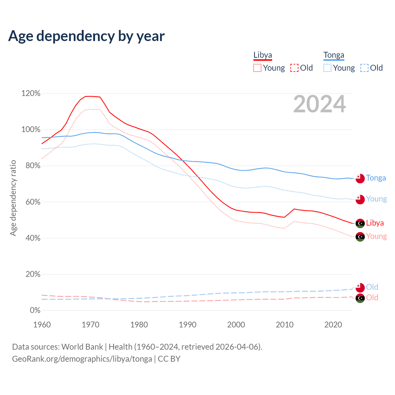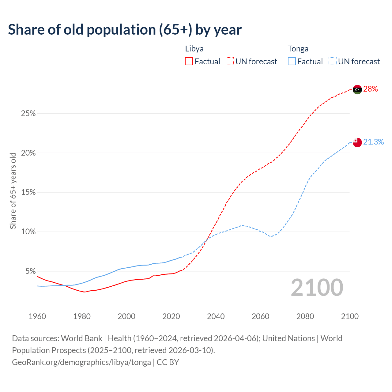 - The share of old-age demographic (65+) in Libya is 5.02% vs 6.72% in Tonga.