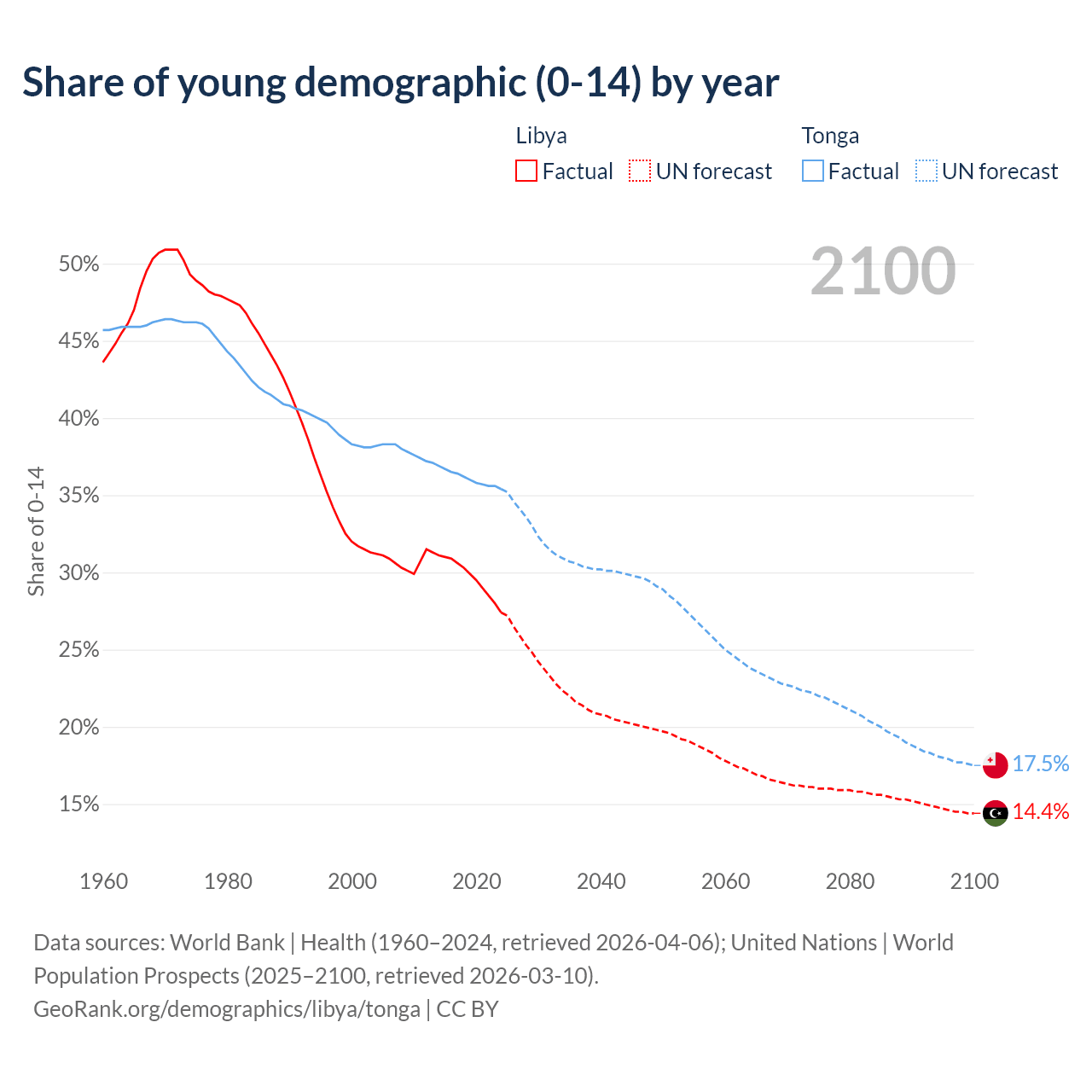 - The share of young demographic (0-15 years old) in Libya is 27.4% vs 35.4% in Tonga.