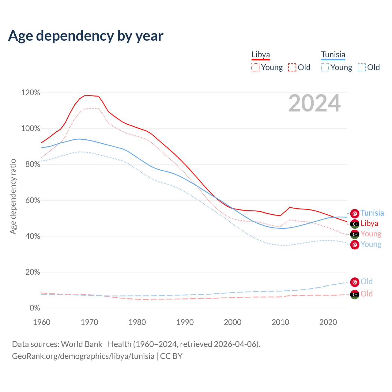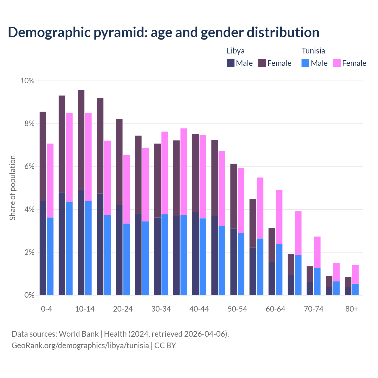 - Libya is ranked 114/196 by median age (oldest to youngest) vs 86/196 for Tunisia.