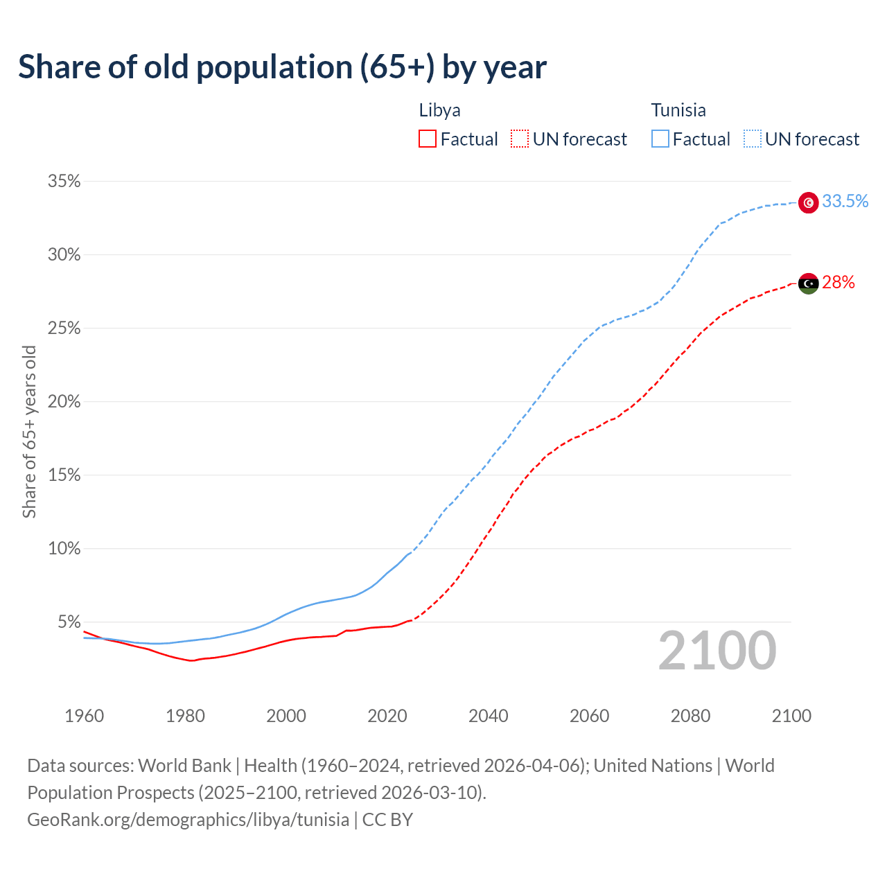 The share of older people aged 65 and over is 5.02% in Libya and 9.53% in Tunisia. Life expectancy in Libya compared to Tunisia .