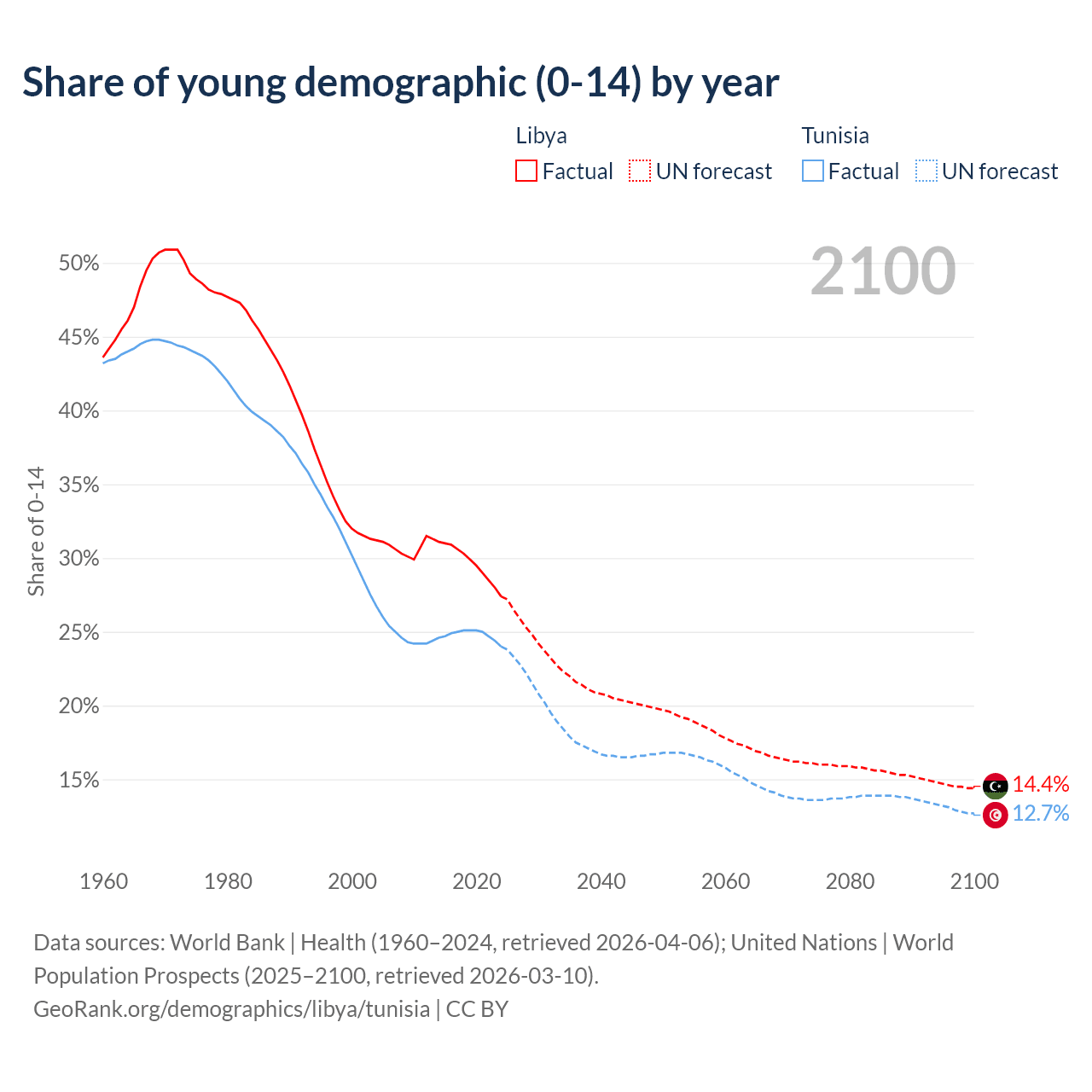 - The share of young demographic (0-15 years old) in Libya is 27.4% vs 24% in Tunisia.