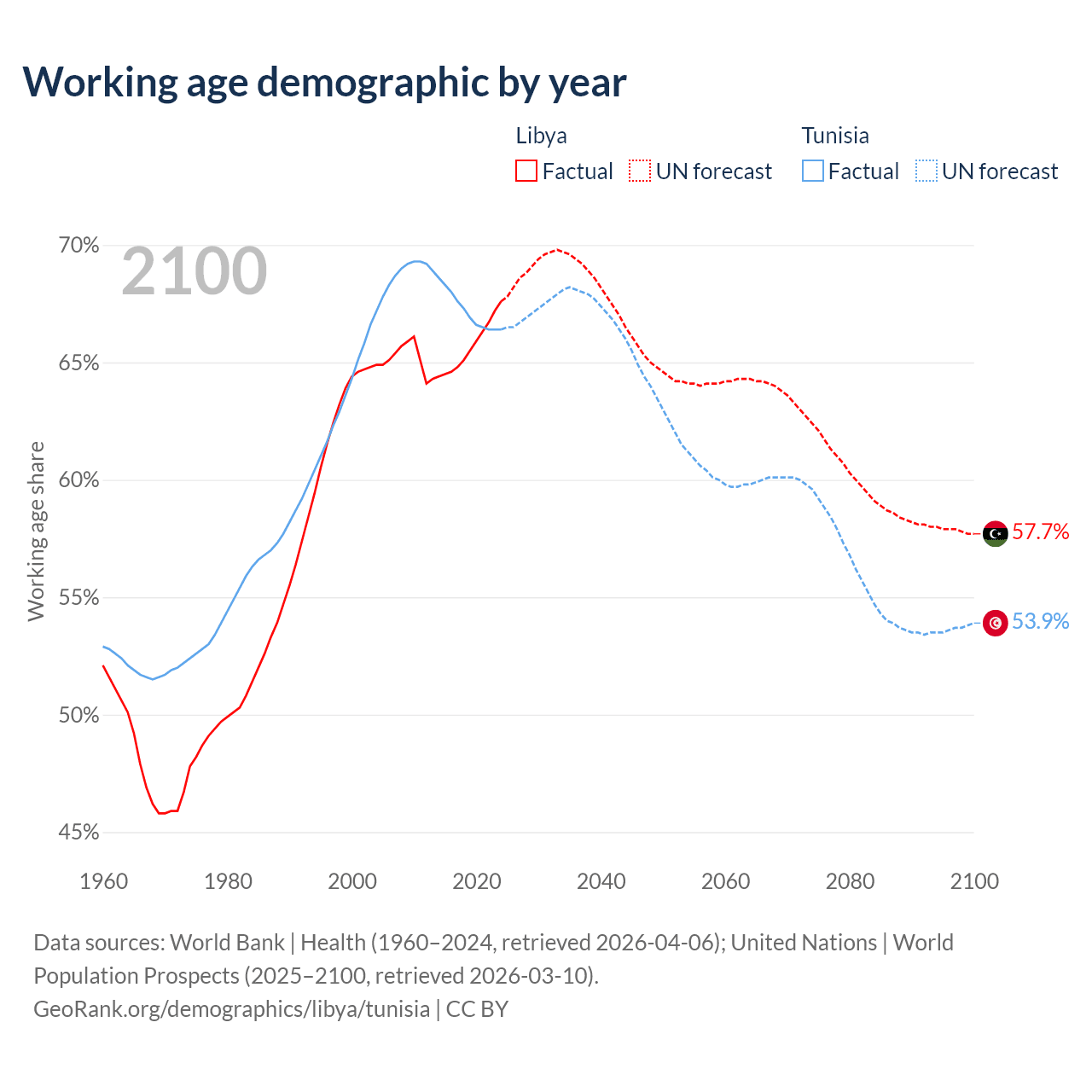 - Libya has 5.11M working age adults (aged 15-64) vs 8.26M in Tunisia.