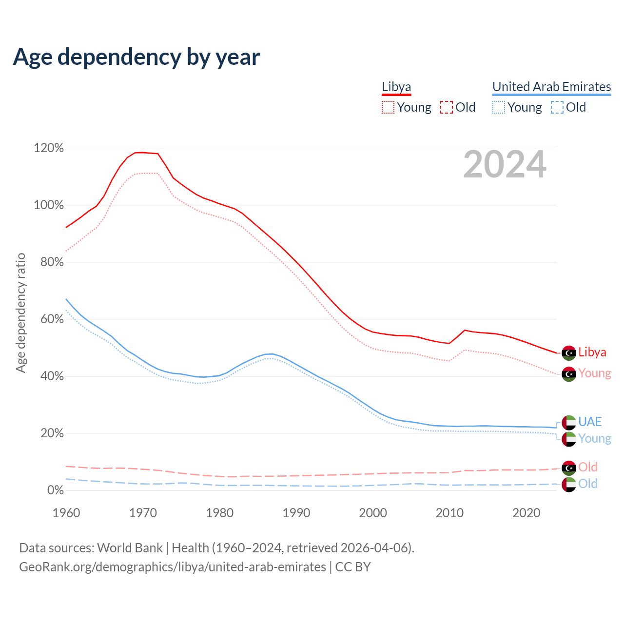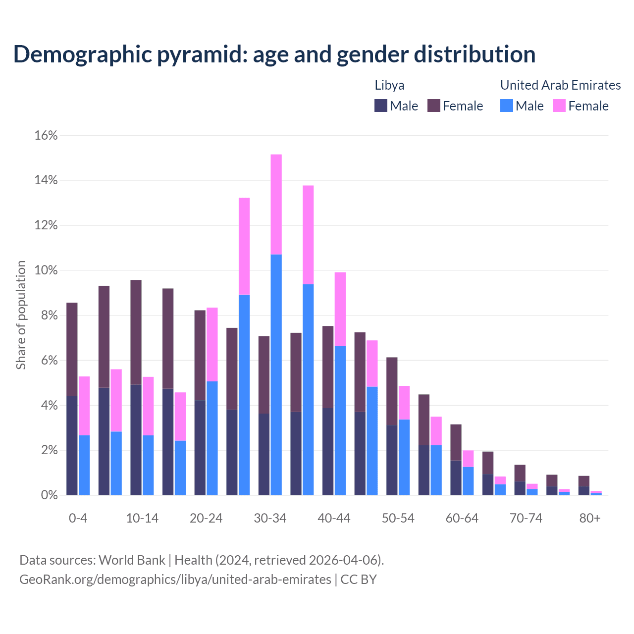 - Libya is ranked 114/196 by median age (oldest to youngest) vs 91/196 for the United Arab Emirates.