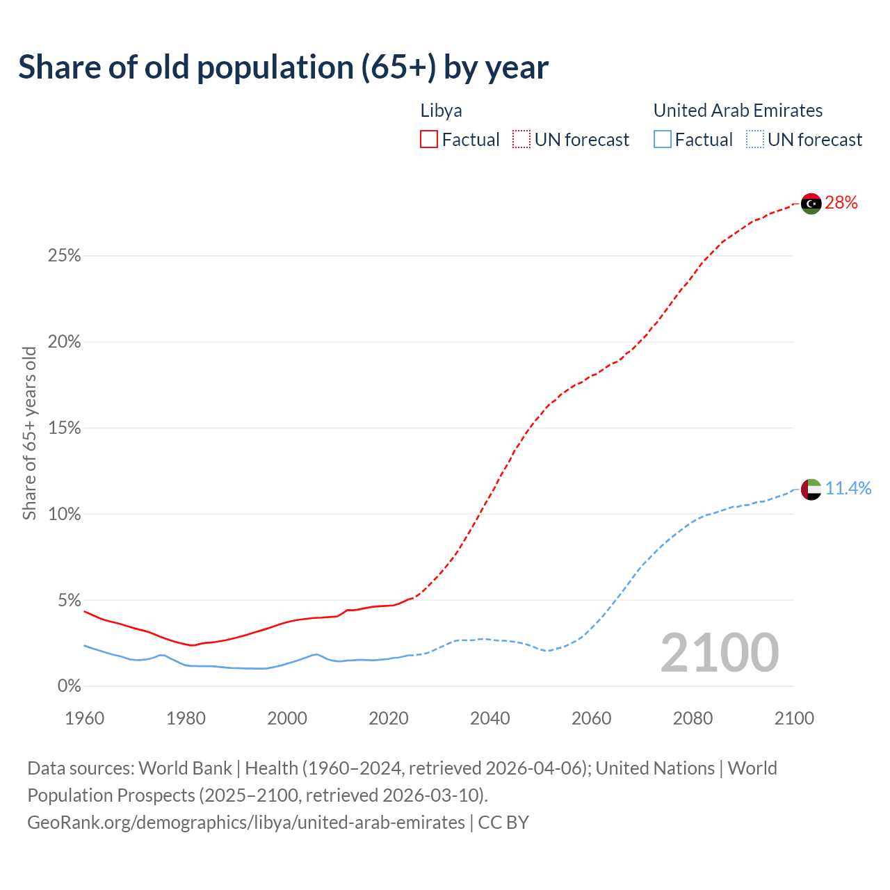 - The share of old-age demographic (65+) in Libya is 5.02% vs 1.77% in the United Arab Emirates.