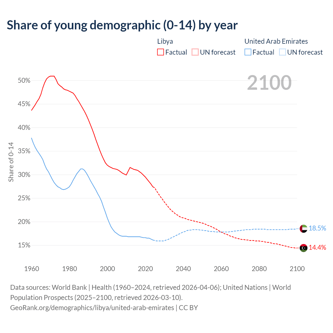- The share of young demographic (0-15 years old) in Libya is 27.4% vs 16.1% in the United Arab Emirates.
