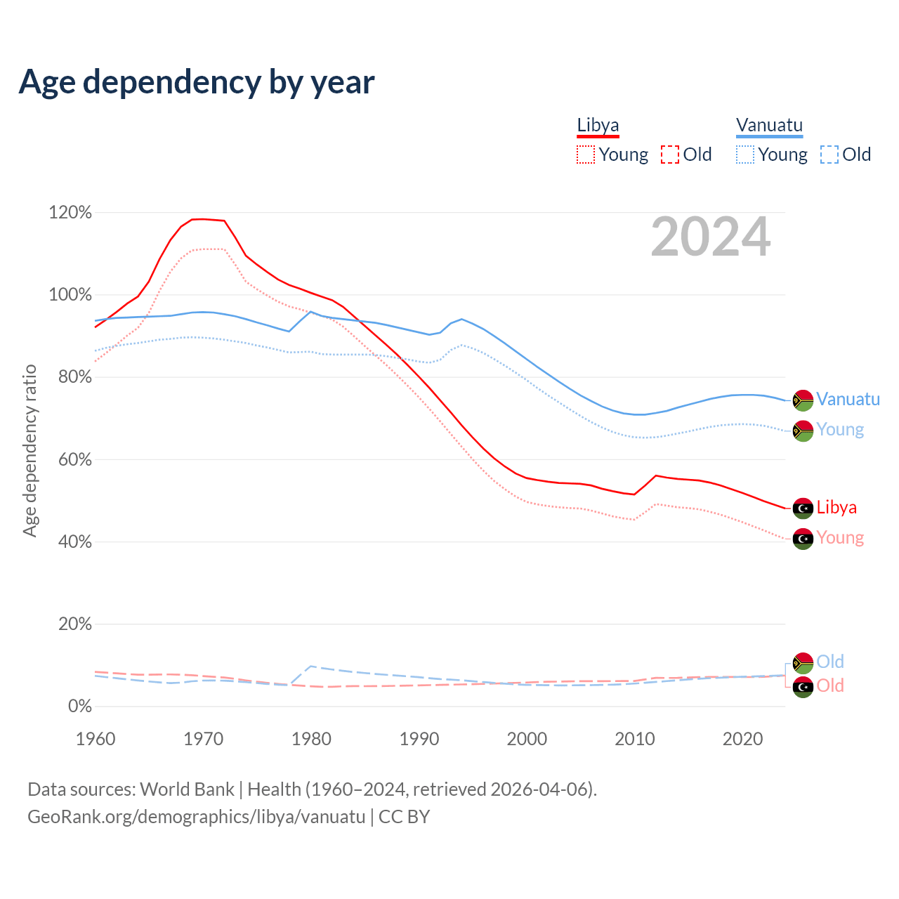 - Libya is ranked 114/196 by median age (oldest to youngest) vs 156/196 for Vanuatu.