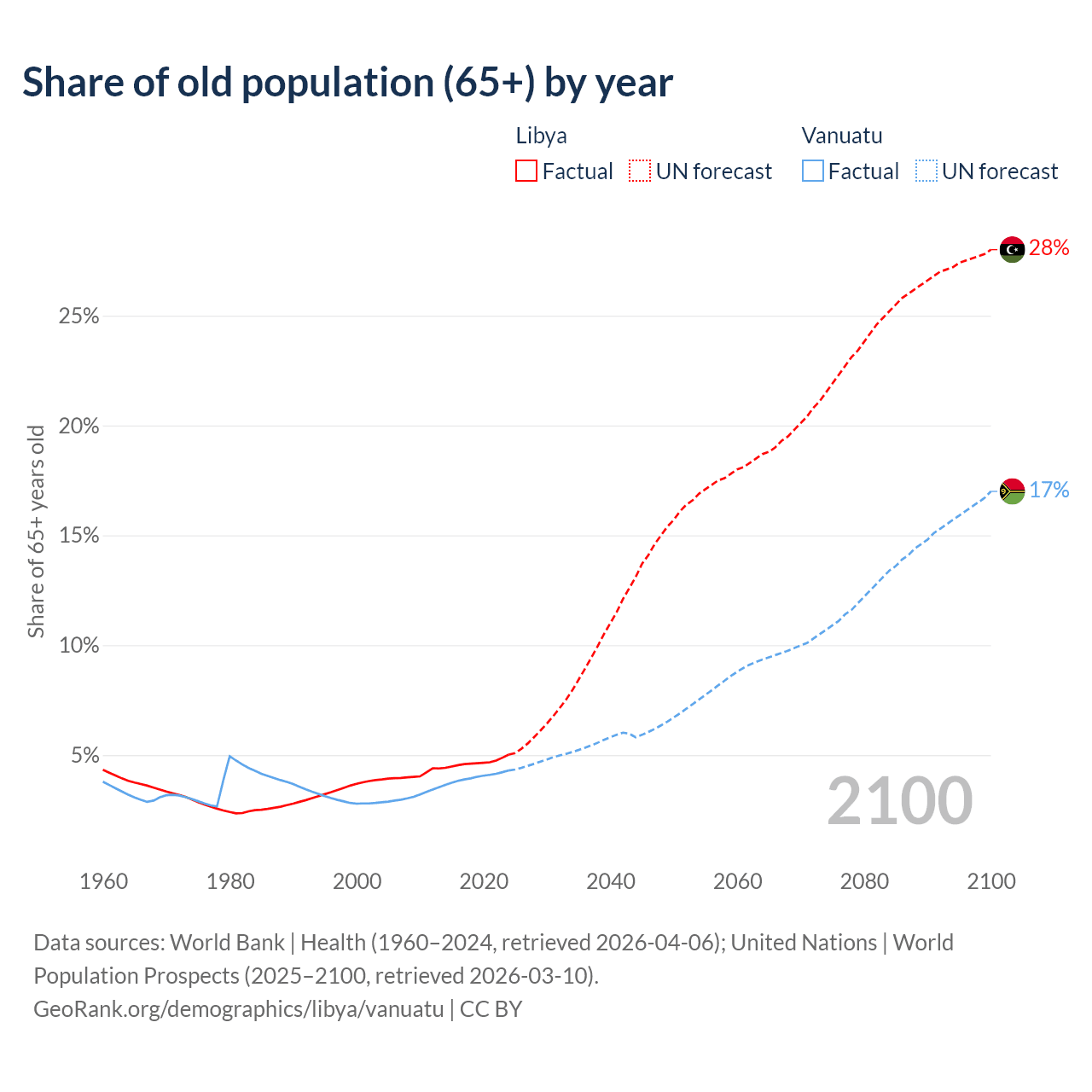 - The share of old-age demographic (65+) in Libya is 5.02% vs 4.3% in Vanuatu.