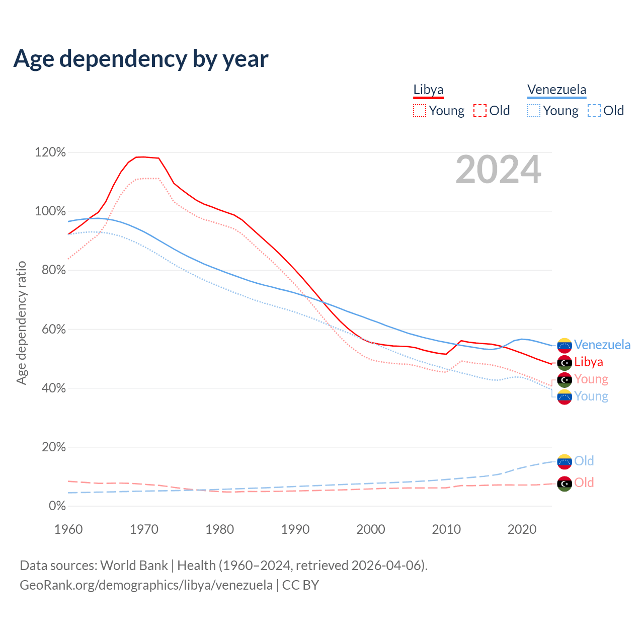 - Libya is ranked 114/196 by median age (oldest to youngest) vs 104/196 for Venezuela.