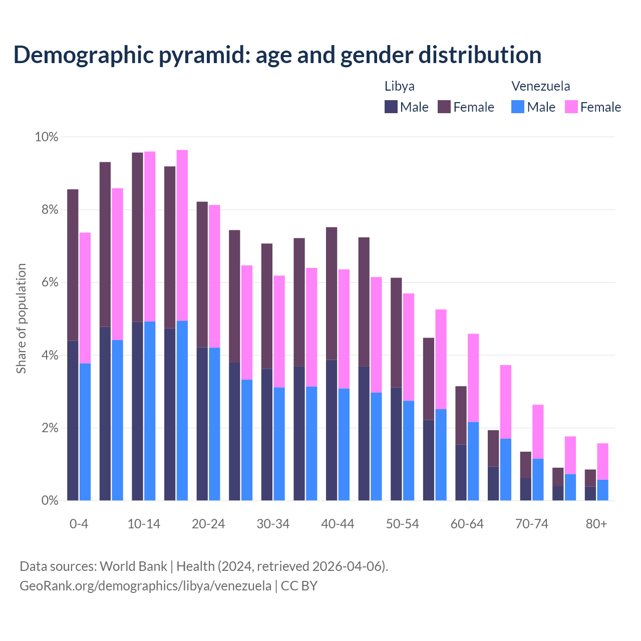 - The median age in Libya is 28.5 years compared to 30.2 years in Venezuela.