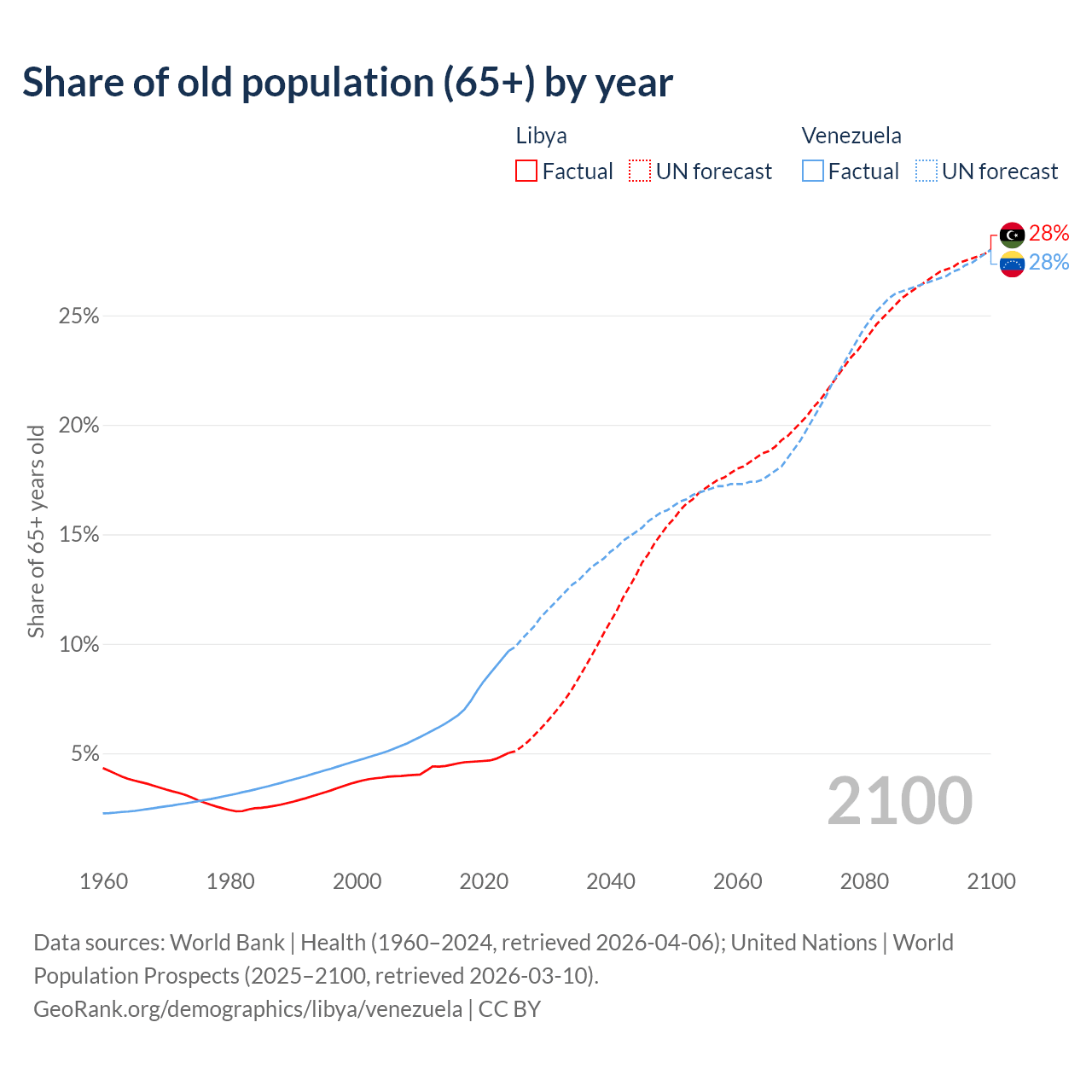 The share of older people aged 65 and over is 5.02% in Libya and 9.68% in Venezuela. Life expectancy in Libya compared to Venezuela .