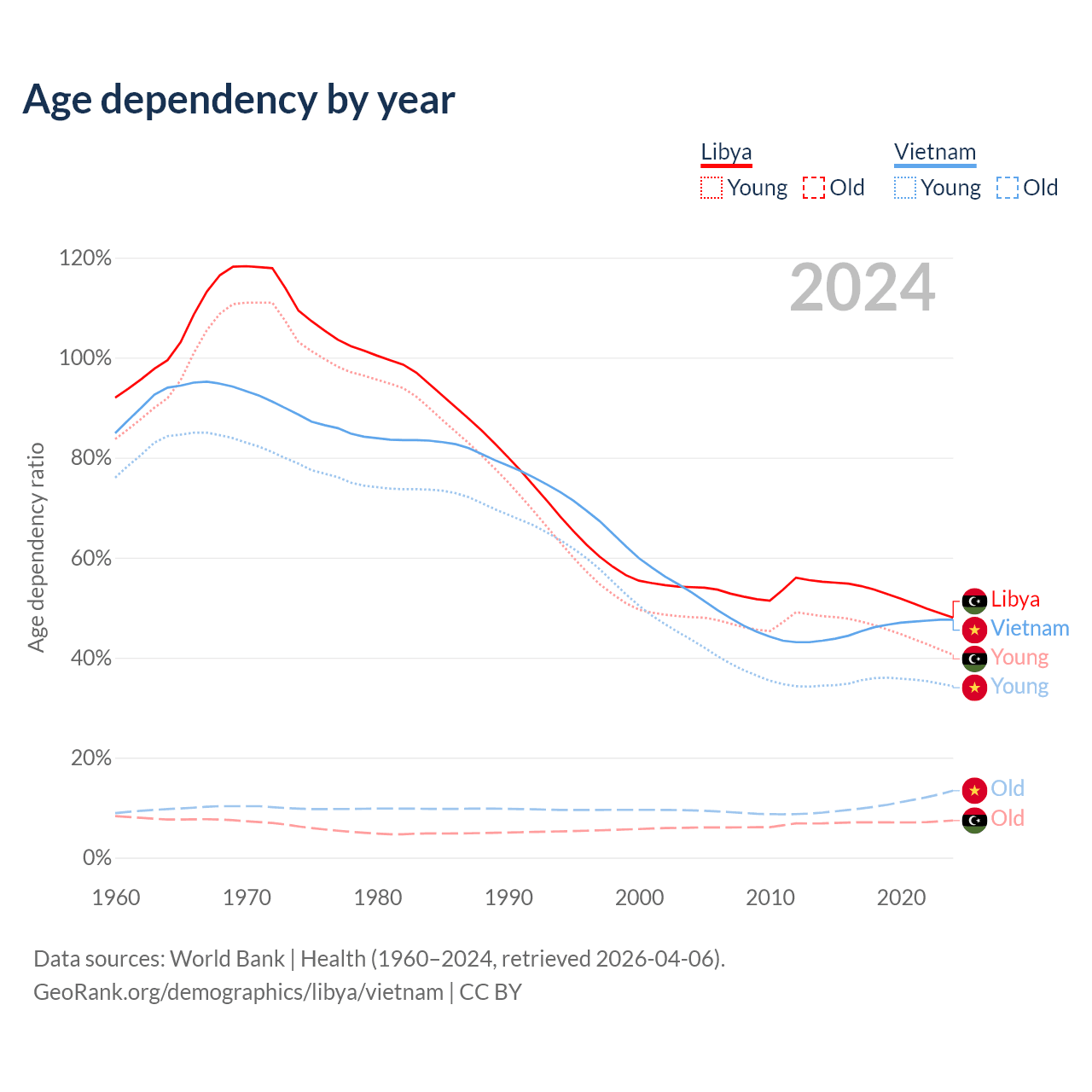 - Libya is ranked 114/196 by median age (oldest to youngest) vs 84/196 for Vietnam.
