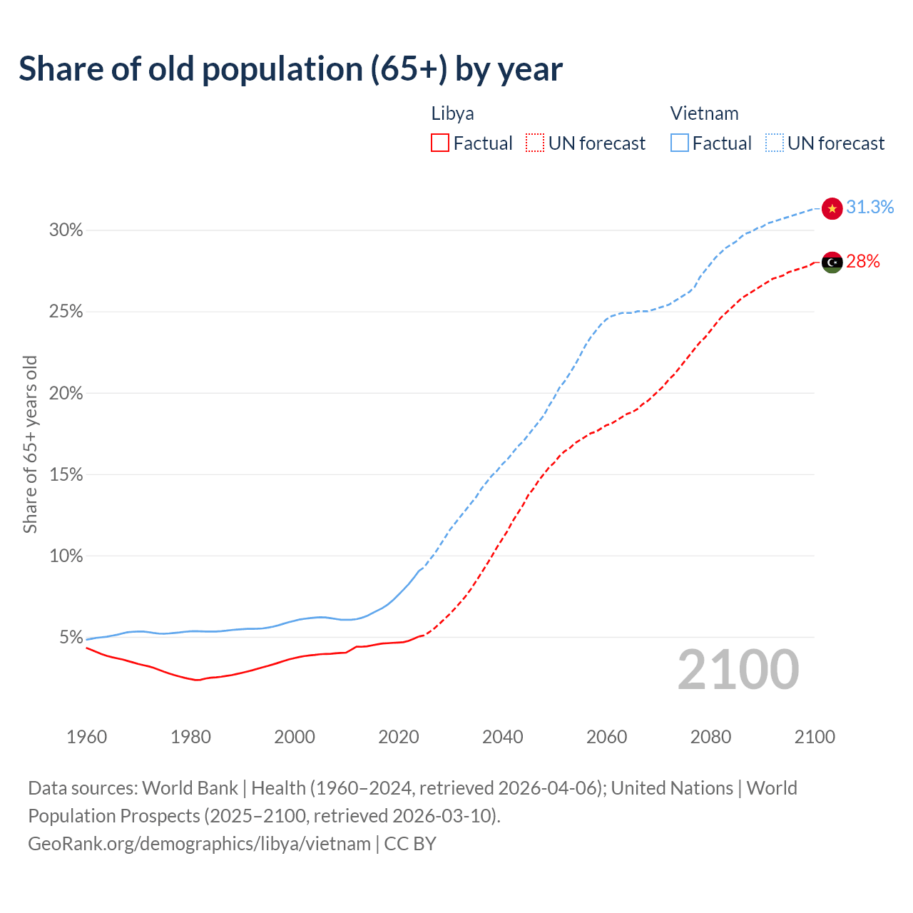 - The share of old-age demographic (65+) in Libya is 5.02% vs 9.05% in Vietnam.