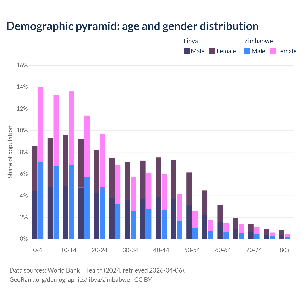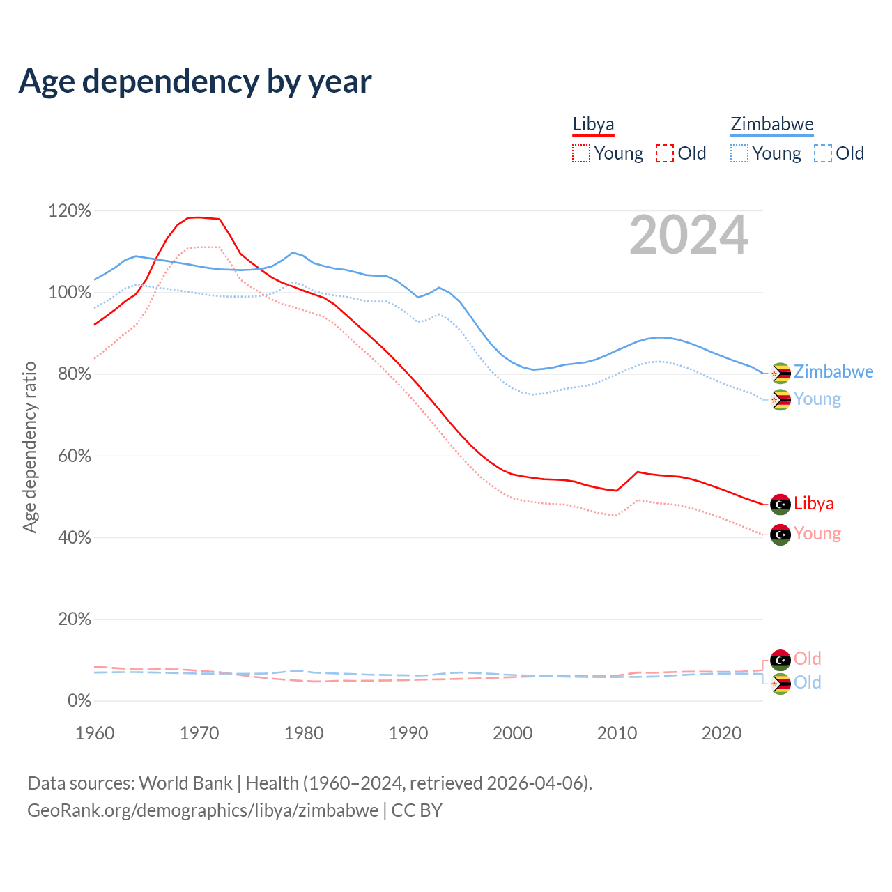 - Libya is ranked 114/196 by median age (oldest to youngest) vs 177/196 for Zimbabwe.