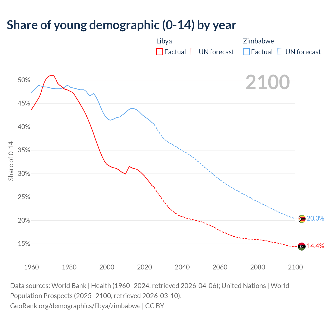 - The share of young demographic (0-15 years old) in Libya is 27.4% vs 40.9% in Zimbabwe.