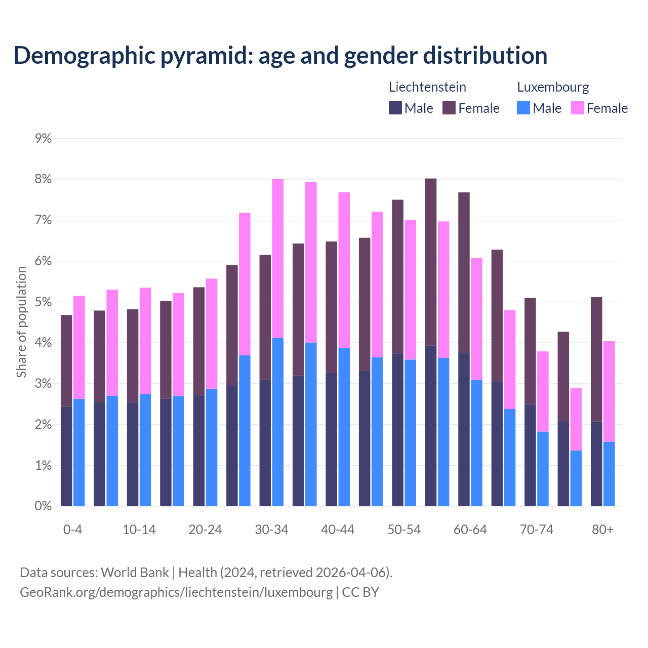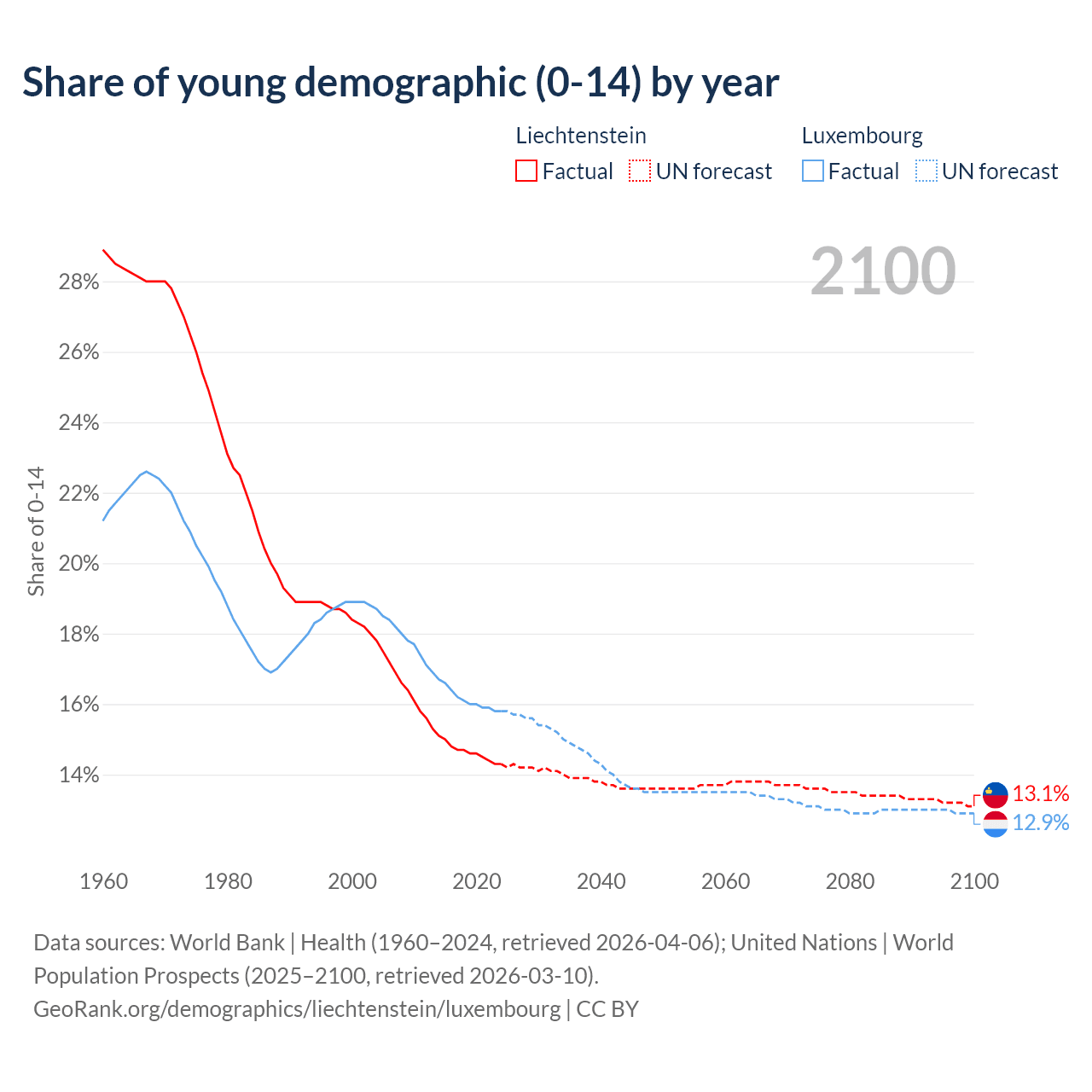 - The share of young demographic (0-15 years old) in Liechtenstein is 14.3% vs 15.8% in Luxembourg.