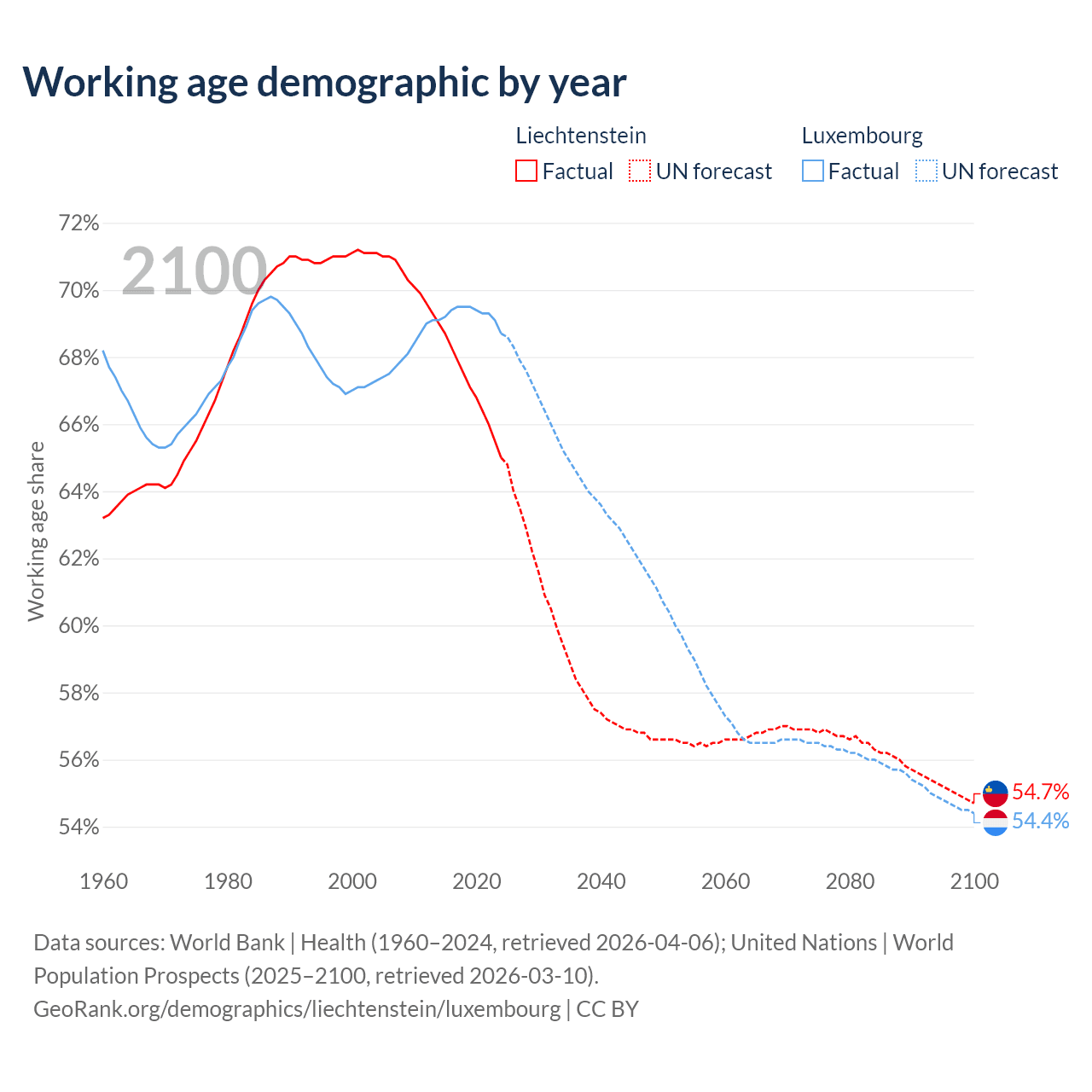 Median age Liechtenstein vs Luxembourg, 1960-2100
