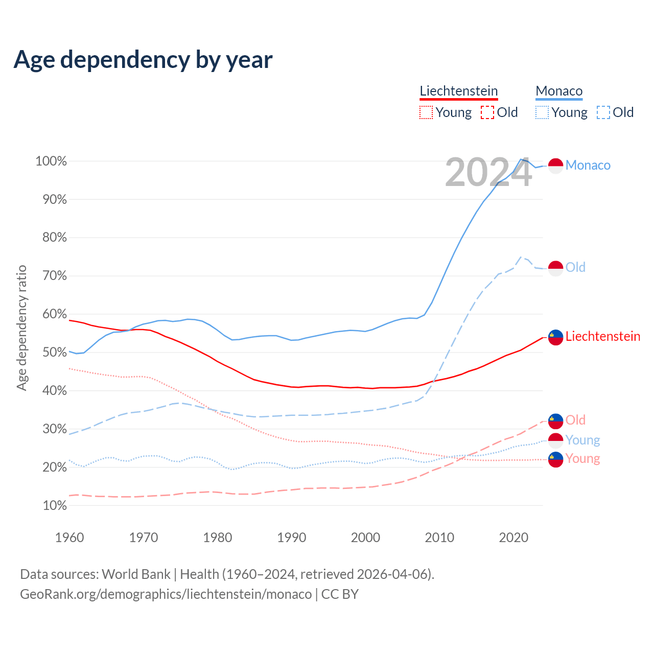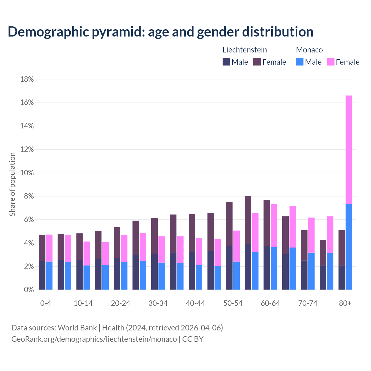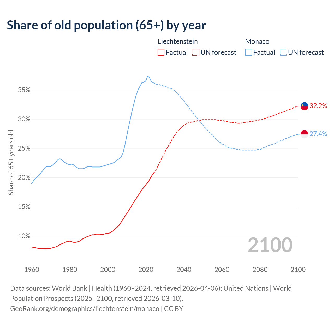 The share of older people aged 65 and over is 20.7% in Liechtenstein and 36.2% in Monaco. Life expectancy in Liechtenstein compared to Monaco .