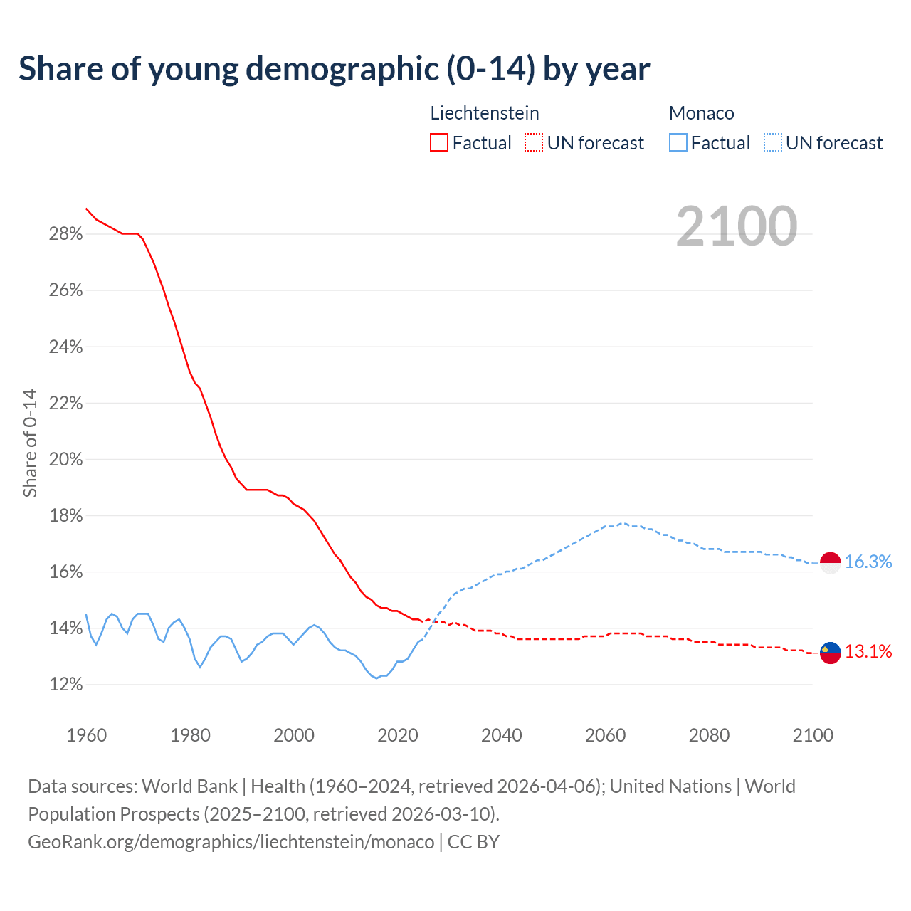 - The share of young demographic (0-15 years old) in Liechtenstein is 14.3% vs 13.5% in Monaco.