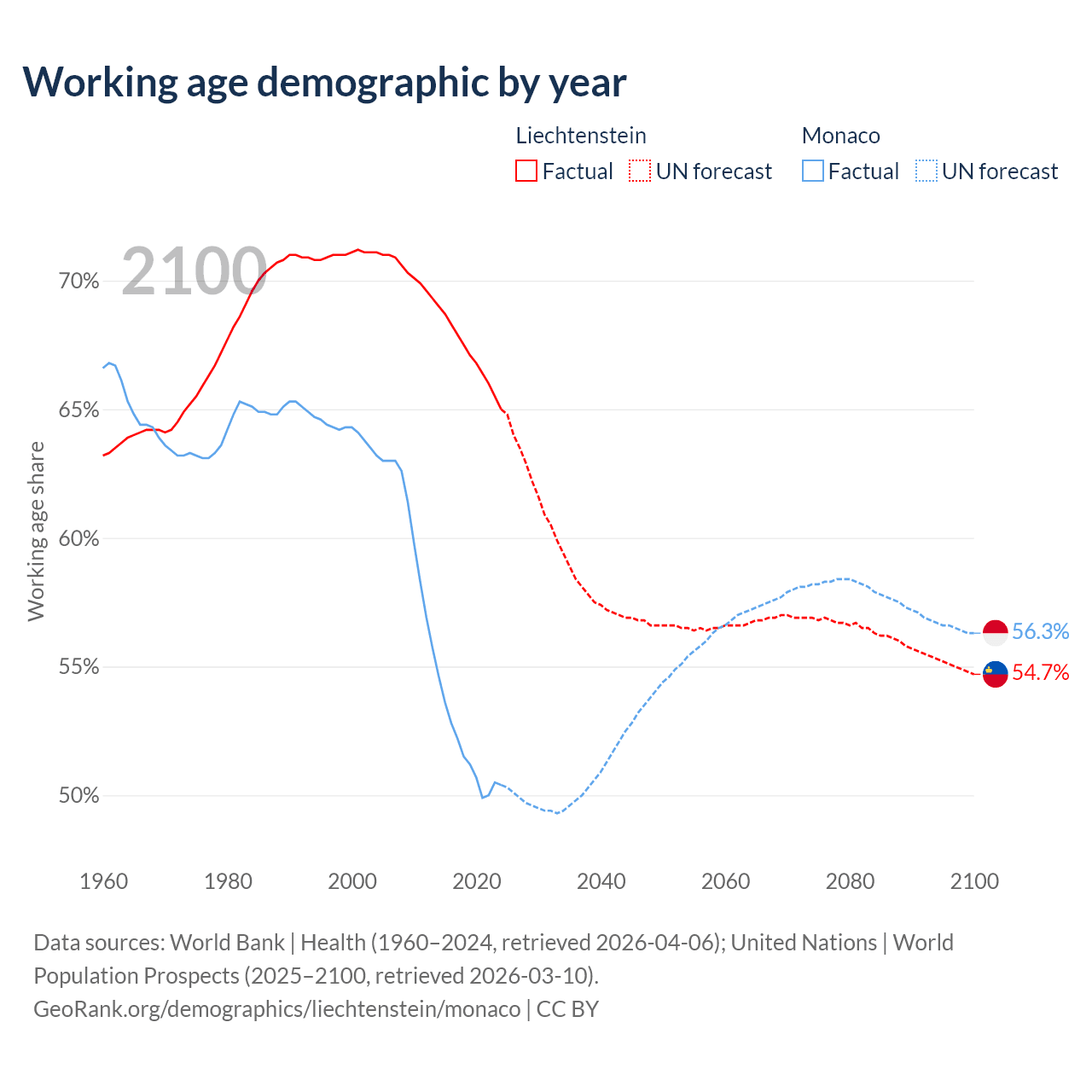 - Liechtenstein has 26.7K working age adults (aged 15-64) vs 19.2K in Monaco.