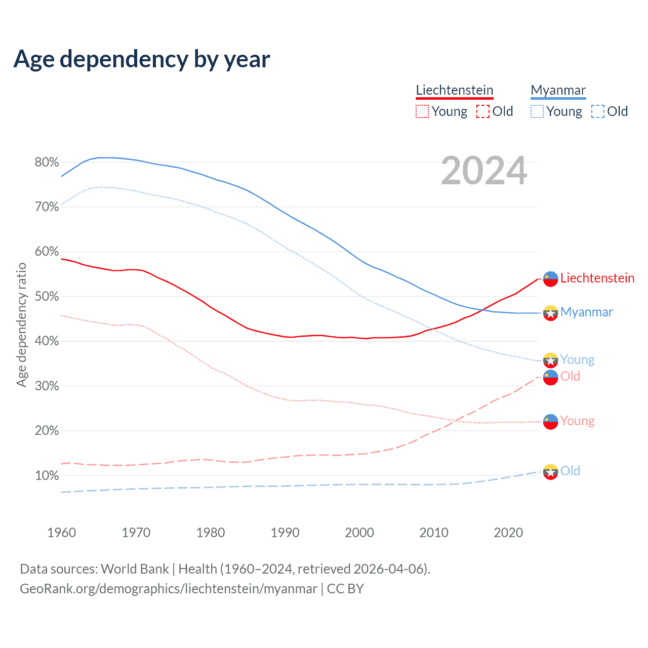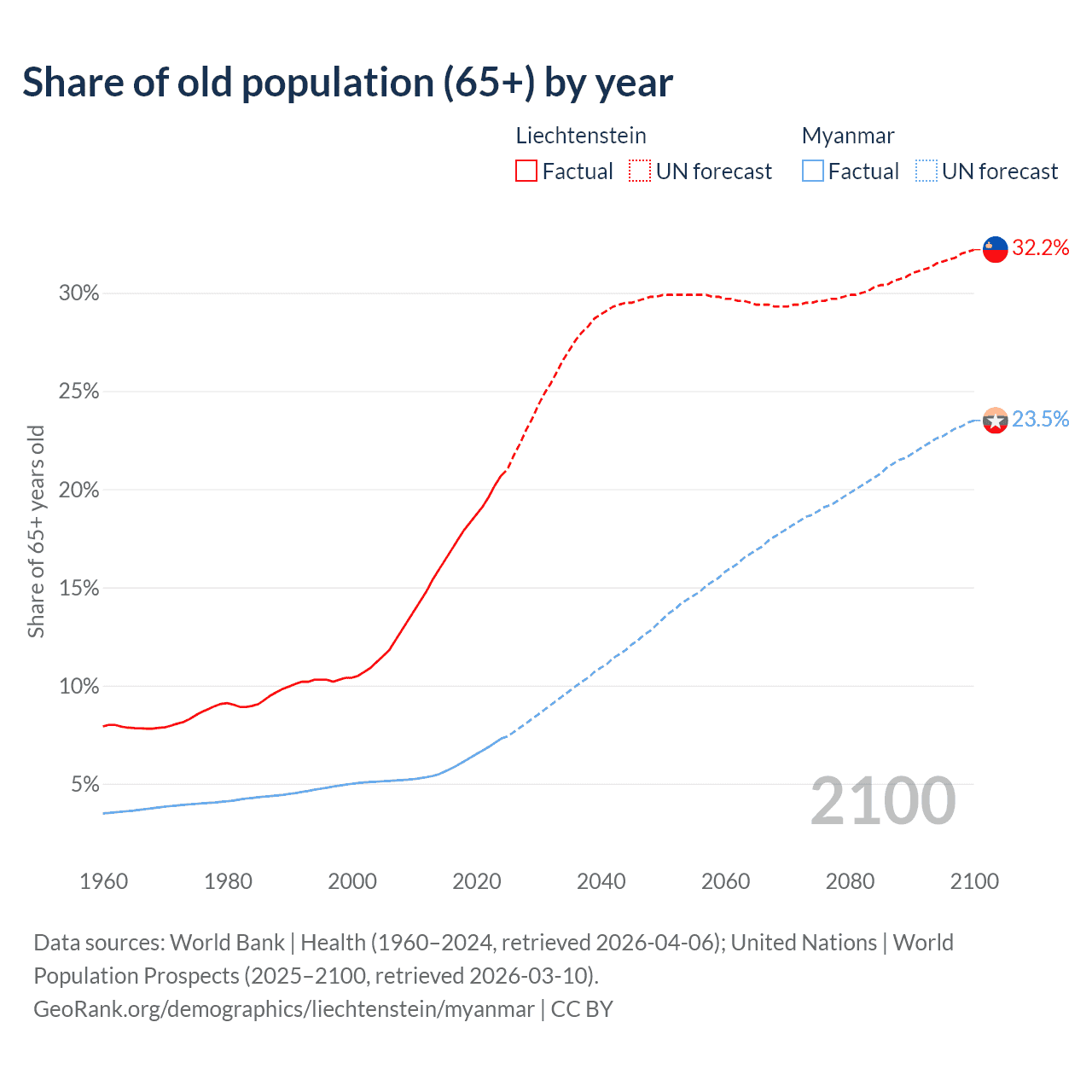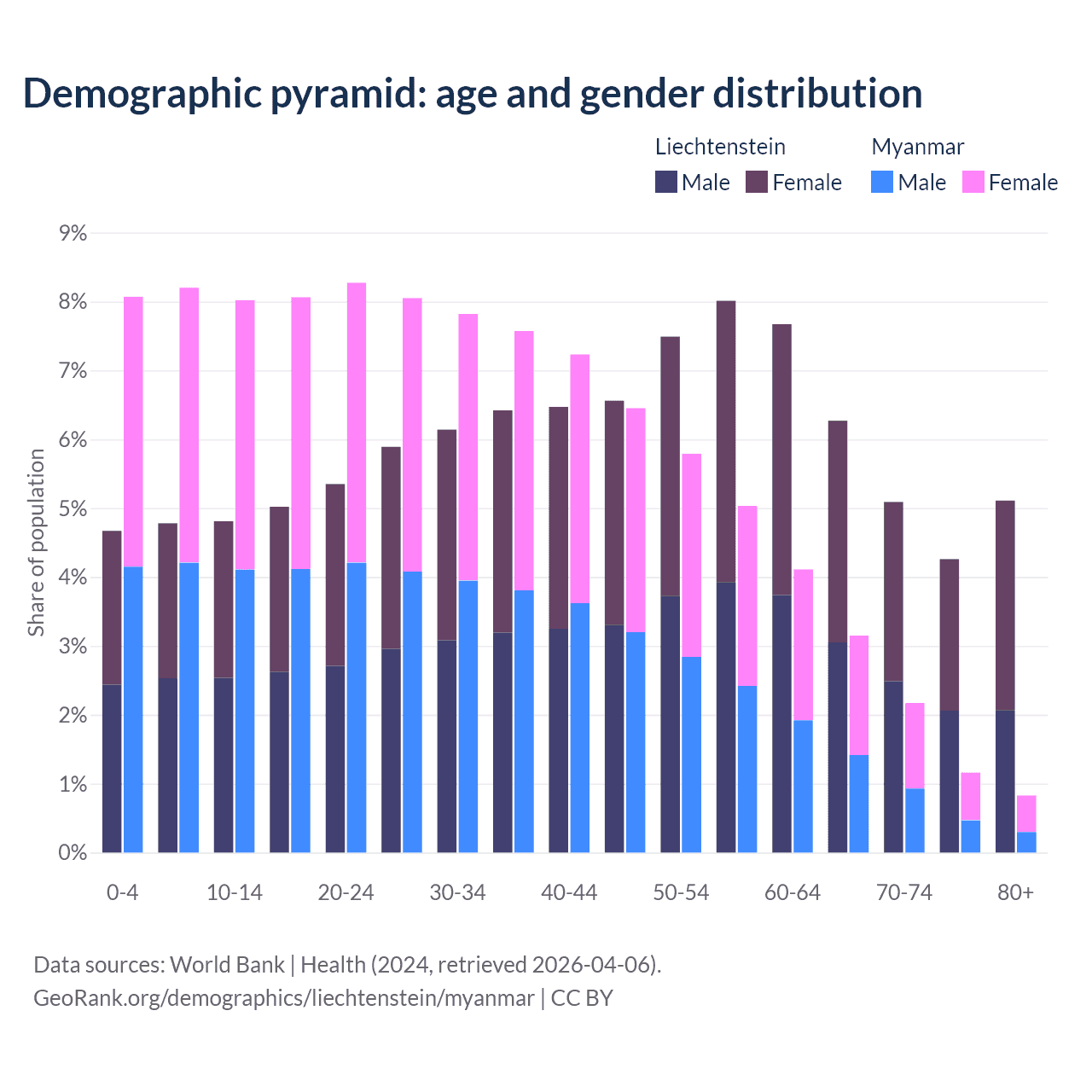 - The share of old-age demographic (65+) in Liechtenstein is 20.7% vs 7.3% in Myanmar.