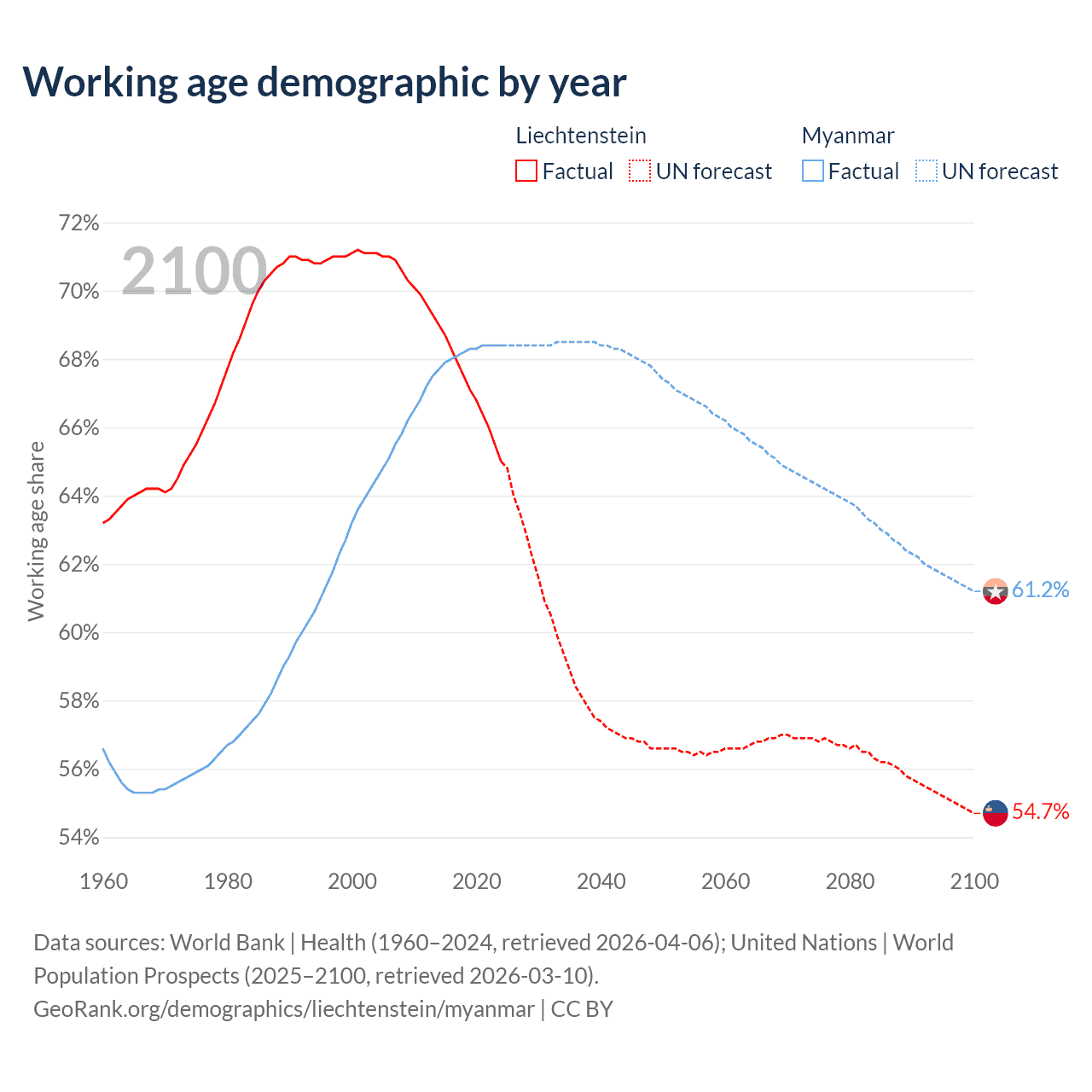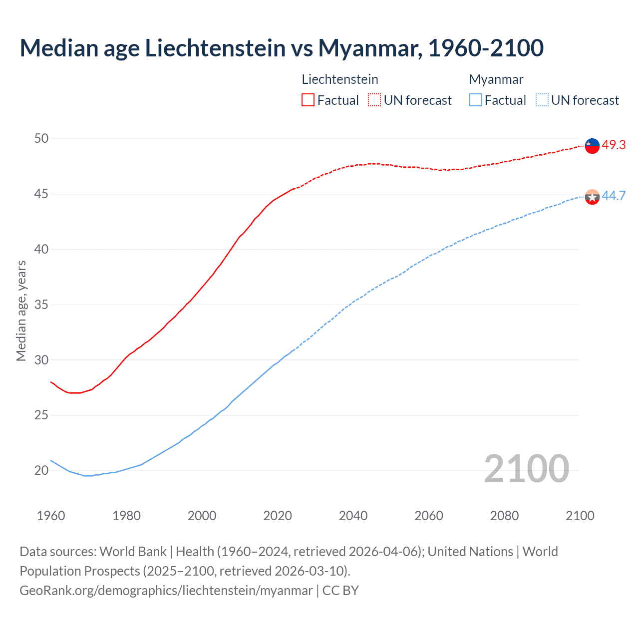 Median age Liechtenstein vs Myanmar, 1960-2100