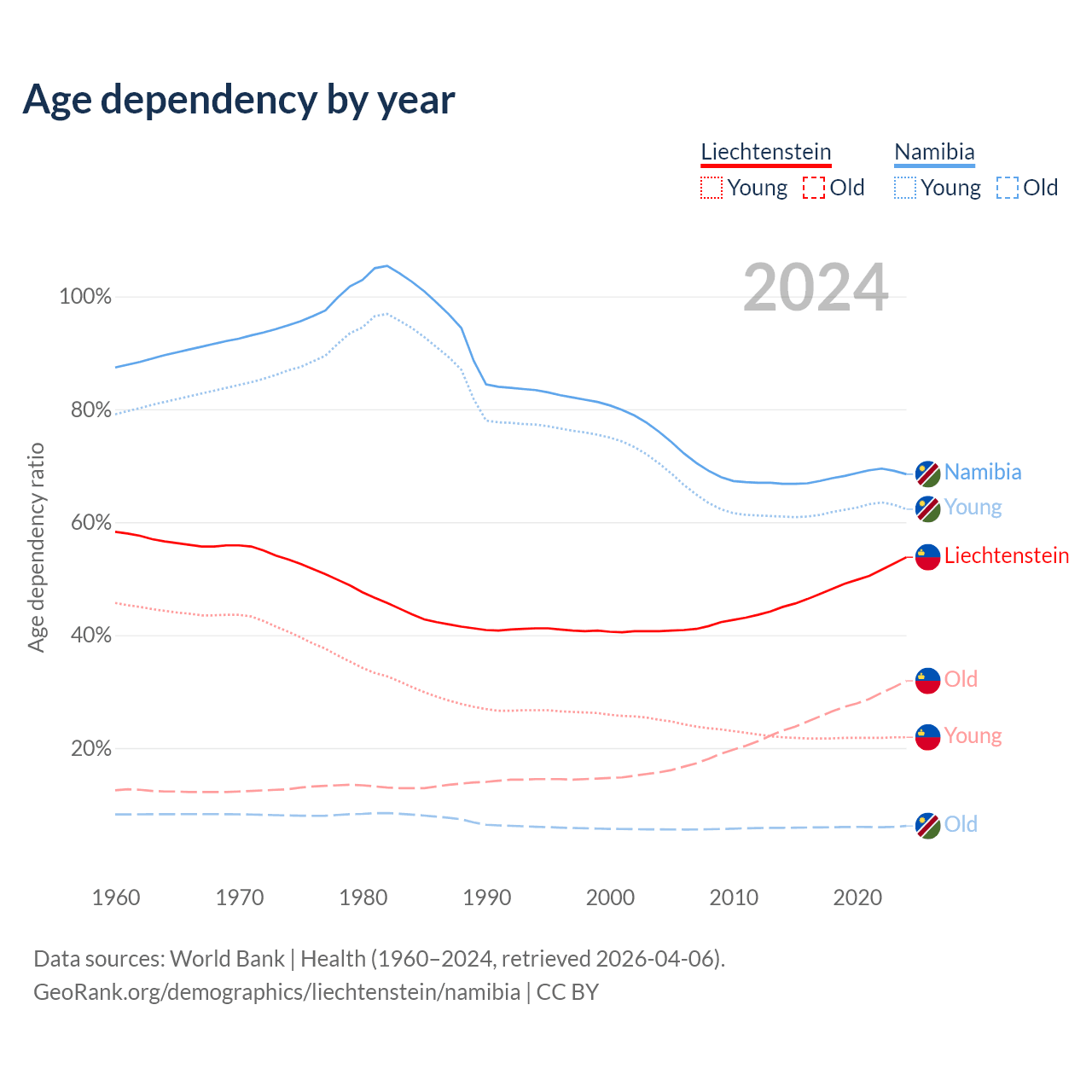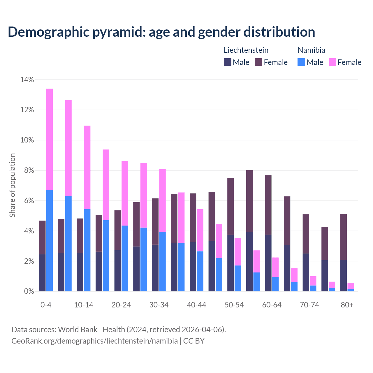 - The share of old-age demographic (65+) in Liechtenstein is 20.7% vs 3.67% in Namibia.