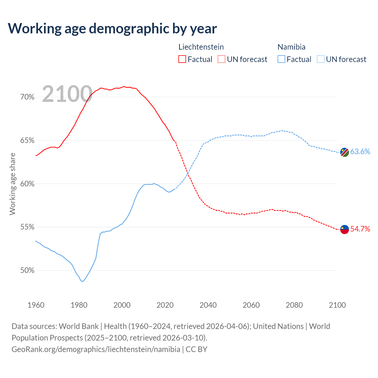 - Liechtenstein has 26.7K working age adults (aged 15-64) vs 1.88M in Namibia.