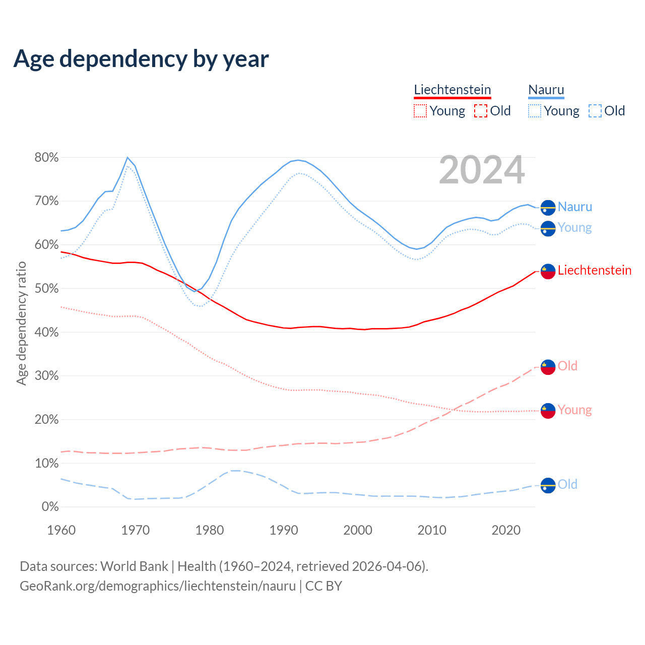 - The share of old-age demographic (65+) in Liechtenstein is 20.7% vs 2.85% in Nauru.